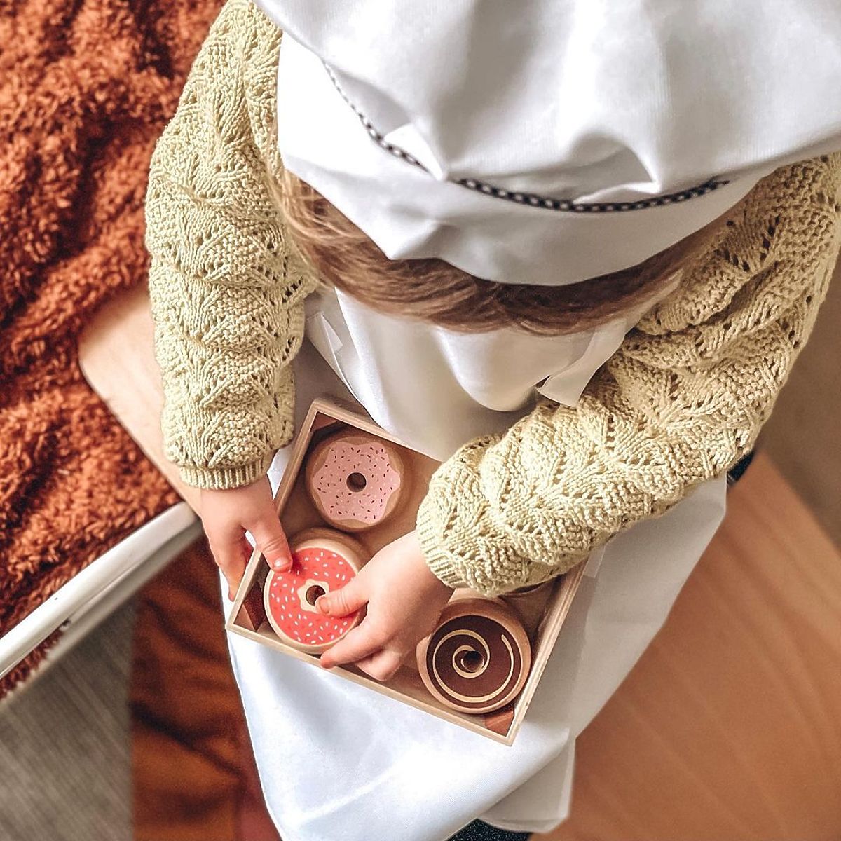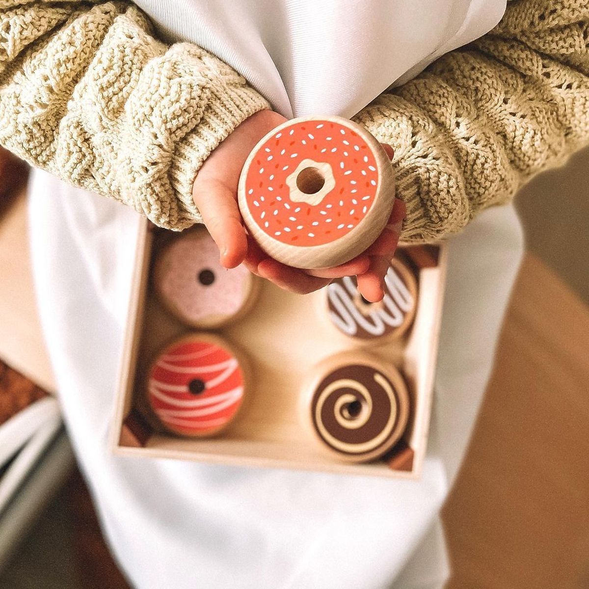 Scatola in legno con ciambelle che sembrano realistiche e molto gustose. Puoi mangiarle da solo o condividerle con gli altri! Un giocattolo ideale che introduce .. altro