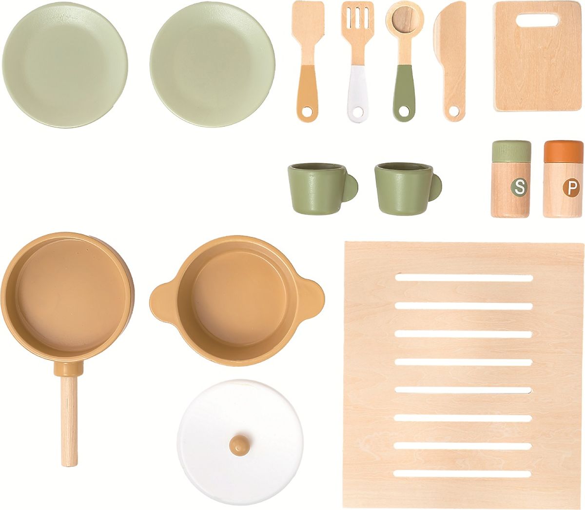 Hai voglia di una torta fatta in casa calda? O forse desideri qualcosa di fritto? Con questa cucina puoi avere il menu che desideri. È infatti completamente attrezzata! Troverai tutto ciò che non può mancare in una cucina moderna: fornello con forno, fabbricatore di ghiaccio, microonde, lavello, macchina da caffè e naturalmente stoviglie e utensili, come piatti, pentola, padella, tazze, coltello, mestolo e altro ancora. Grazie alle ante apribili e alle manopole girevoli, il piacere del gioco è ancora più realistico. Tutto è realizzato in legno robusto di alta qualità e trattato con vernici atossiche. Quindi, indossa il cappello da chef, metti il grembiule e inizia a cucinare! Contenuto della confezione: 2 piatti, 2 tazze, 1 padella, 1 pentola, 1 coperchio, 1 pepiera, 1 saliera, 1 tagliere, 4 utensili, griglia per il forno. Principali caratteristiche: accessori ricchi, multifunzionale, uso vario, sviluppa abilità comunicative e sociali, motiva al gioco immaginativo, adatto per bambini fino a 3 anni