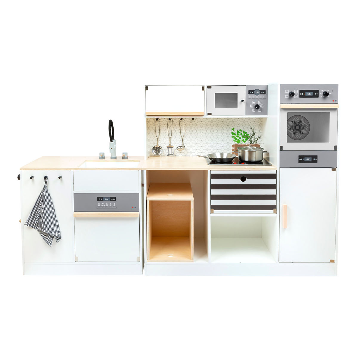 Per tutti i cuochi e le casalinghe! Questa grande cucina per bambini completamente attrezzata offre tutti gli elettrodomestici di una casa moderna. Grazie al suo sistema modulare, può essere assemblata come una cucina ad angolo o come una cucina lineare con isola funzionante, offrendo così molto spazio e possibilità anche per il gioco di più bambini contemporaneamente. Le manopole girevoli scattano e il piano cottura con luce e suono alimentati a batteria (batterie non incluse) garantiscono un piacere di gioco realistico. Gli armadietti offrono ampio spazio di archiviazione e sono dotati di ante. Sono inclusi utensili di alta qualità realizzati in metallo. Per la cucina è disponibile anche un'ampia gamma di accessori aggiuntivi. Il prodotto richiede montaggio, fornito con istruzioni illustrate per l'assemblaggio. Caratteristiche principali: cucina per bambini: fornello, forno, microonde, frigorifero, spazi di archiviazione isola cucina: lavello, lavatrice, lavastoviglie accessori: pentola, padella, piatto girevole, cucchiaio, mestolo, strofinaccio effetti luminosi e sonori (batterie non incluse) multifunzionale, utilizzo variegato robusta e resistente