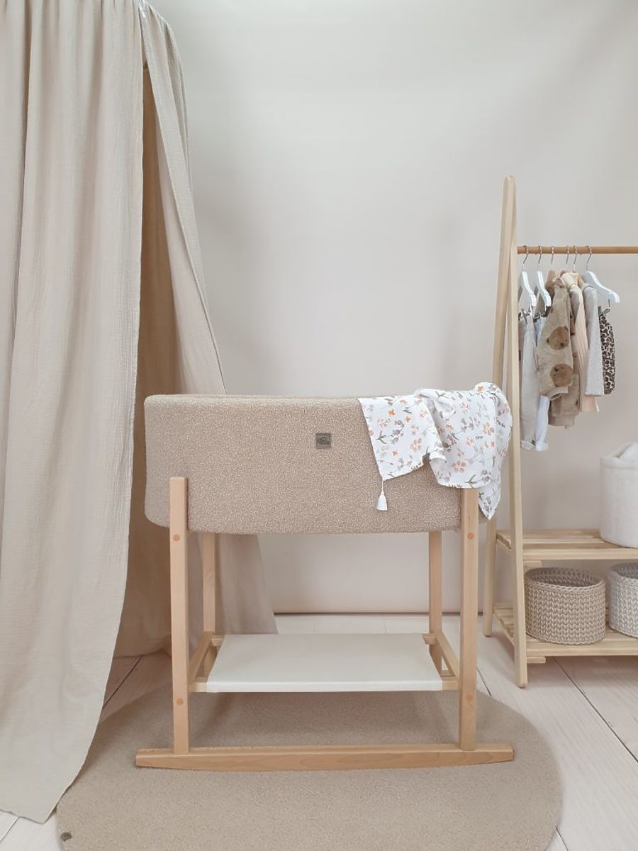 Questa unica Cesta di Mosè è realizzata a mano con materiali di prima qualità. La base in legno stabile e i lati robusti in schiuma anallergica garantiscono sicurezza e comfort per il tuo neonato. Grazie al rivestimento moderno in morbido tessuto Teddy (bouclé), la cesta appare accogliente ed elegante, perfettamente integrata in ogni tipo di interni.