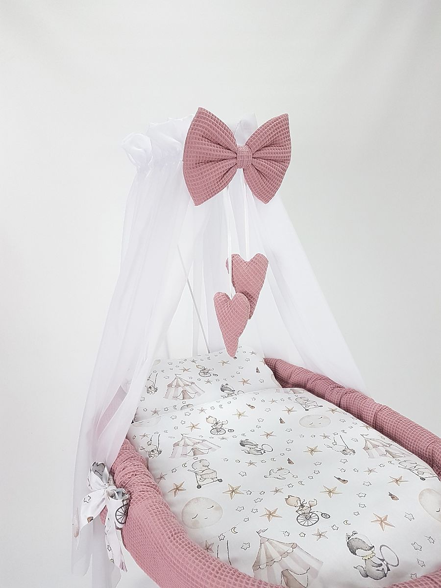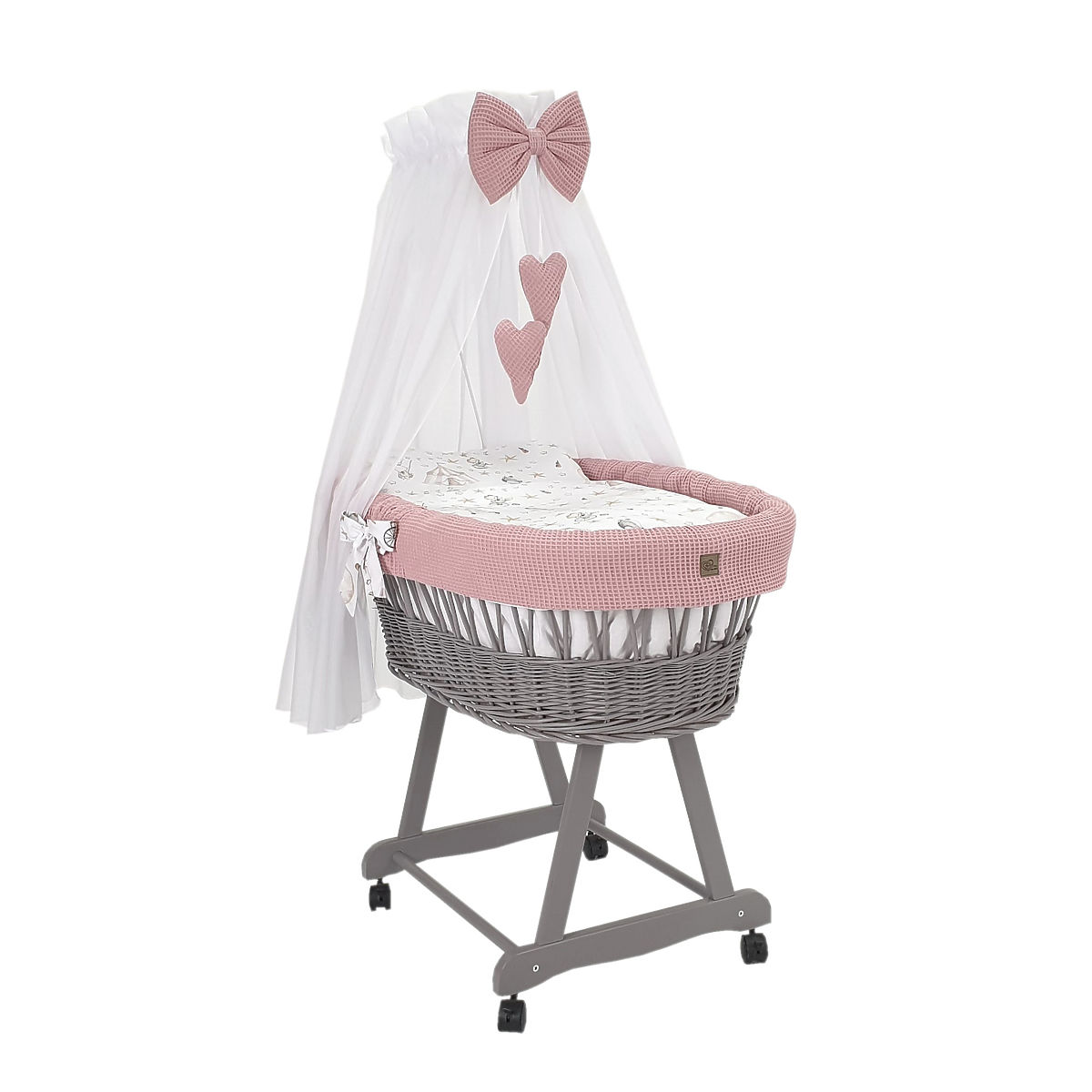 Questa culla in vimini crea un luogo perfetto e accogliente per far dormire il tuo bambino ovunque in casa. Il cesto bianco include un set di biancheria da letto a 5 pezzi con motivo circo in attraente cotone a nido d'ape.