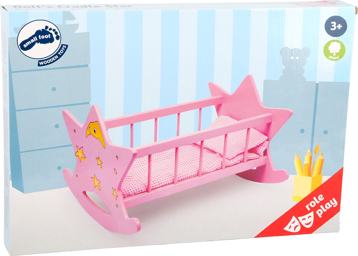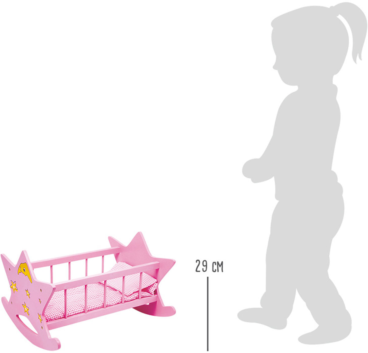 Attenzione a tutti gli osservatori di stelle. Con questa fantastica culla per bambole in legno robusto, i bambini possono dondolare le loro bambole nei sogni. La parte anteriore e posteriore della culla presenta un design a cielo stellato. Principali caratteristiche: supporta il gioco attivo e allena le abilità sociali, struttura stabile, lavorazione di qualità, adatta per asili nido