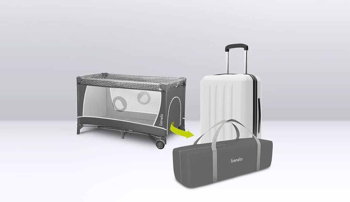 Il lettino da viaggio può essere rapidamente ripiegato fino a ridurlo in piccole dimensioni e trasportato nella pratica borsa , che fa parte del set. Due ruote servono per spostare liberamente il lettino. La copertura è facile da pulire.