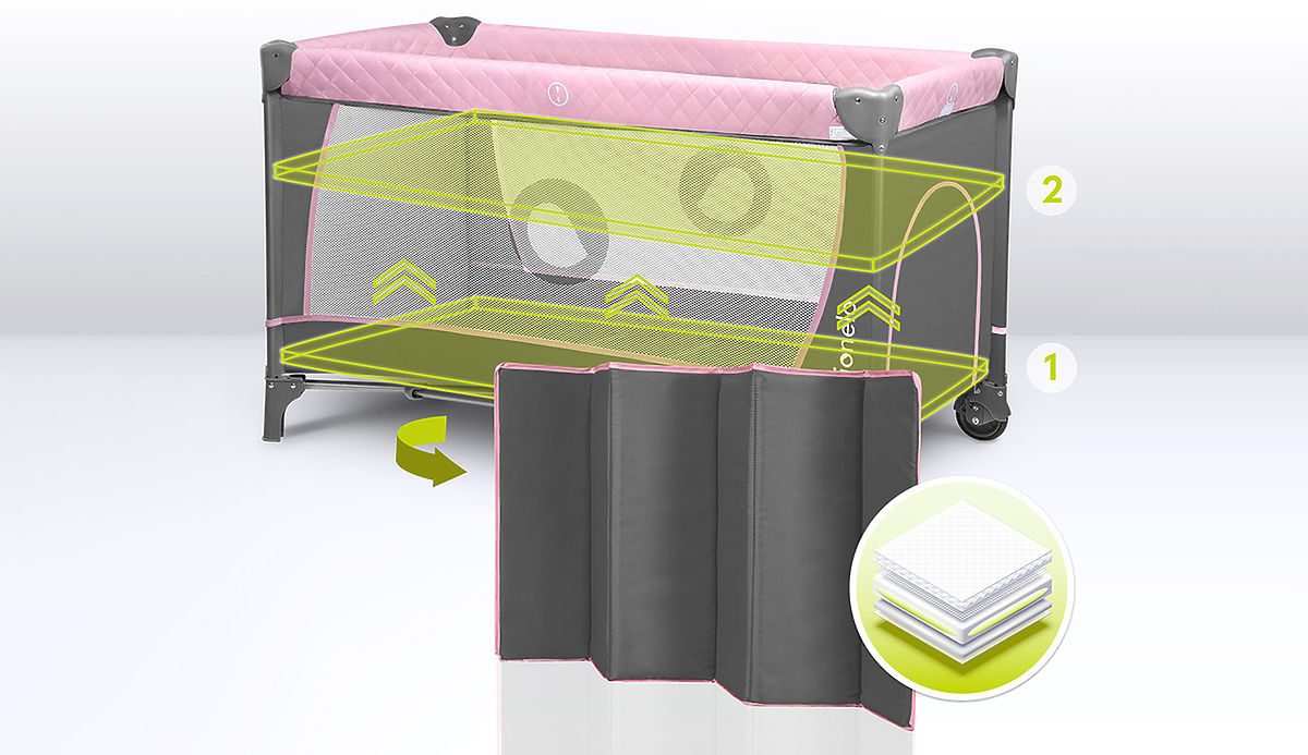Il lettino da viaggio può essere rapidamente ripiegato in piccole dimensioni e trasportato in una pratica borsa , che fa parte del set. Due ruote vengono utilizzate per spostare liberamente la culla. Il rivestimento è facile da pulire.