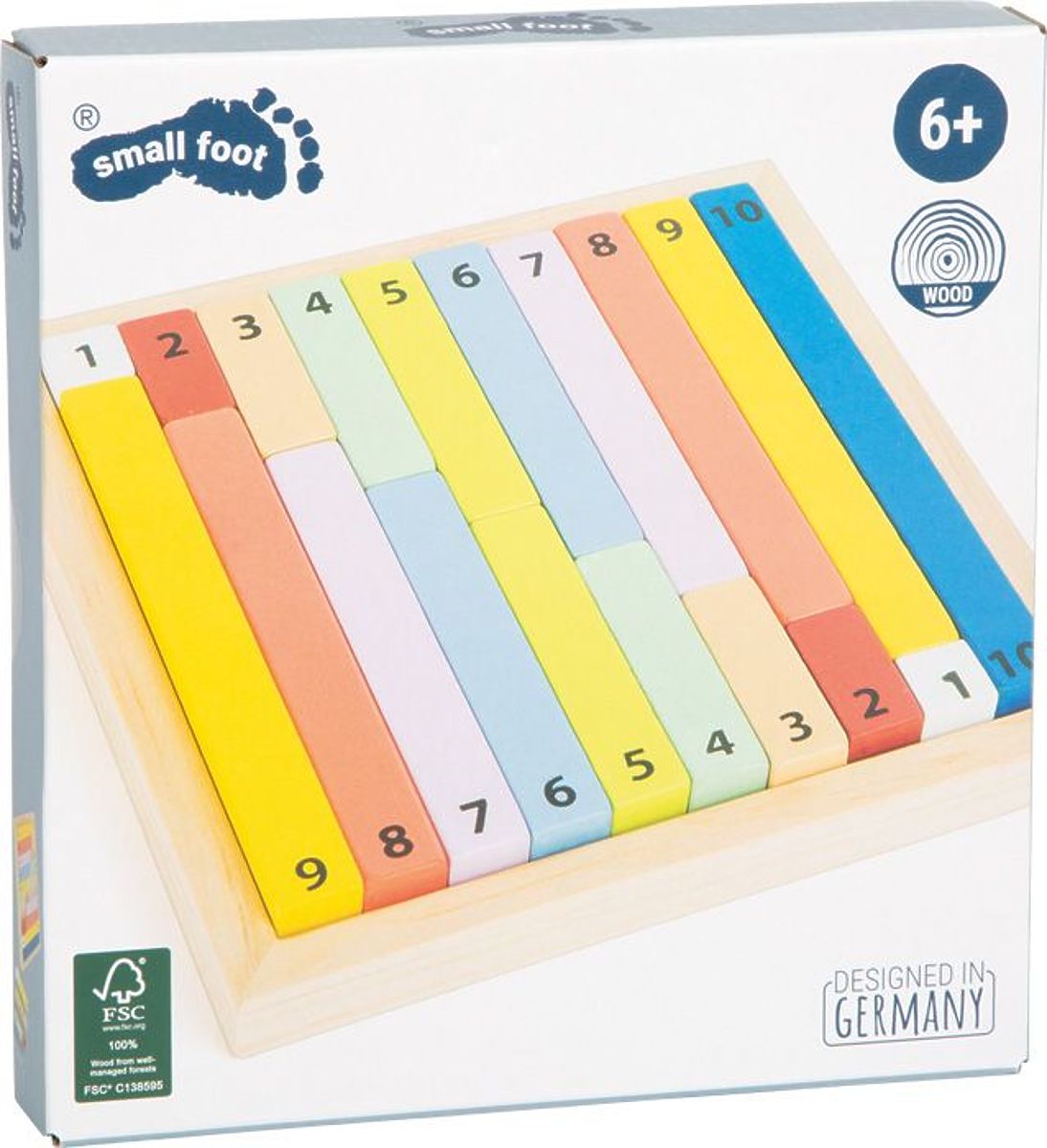 Il puzzle include una base in legno e blocchi colorati. La base è progettata in modo che possa sempre contenere blocchi il cui totale è 10, ad esempio blocco 1 e 9, 7 e 3, 5 e 5, ecc. Poiché ogni blocco con un valore più alto è più grande del precedente, possono anche essere ordinati in successione per mostrare le differenze tra i numeri e insegnare al bambino quale è maggiore, quale minore, ecc. Per una presentazione ancora migliore, ogni blocco ha un colore diverso, ad esempio 1 - bianco, 4 - menta, 7 - viola...