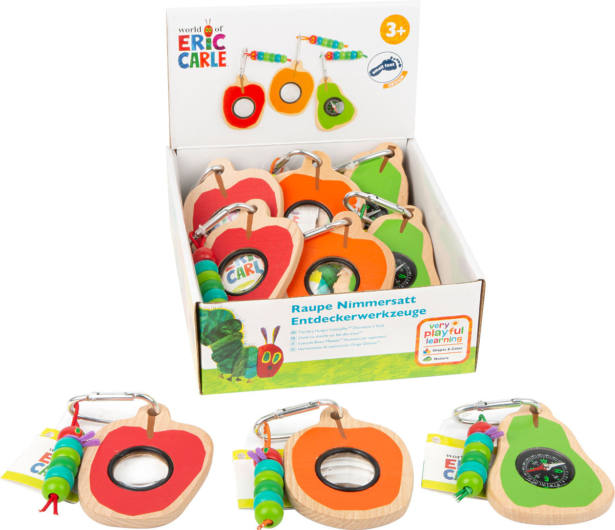 Diventa un ricercatore e scopri il mondo con uno di questi strumenti da esploratore Caterpillar con il tema del bruco affamato. La bussola indica la direzione in cui si muovono i giovani esploratori, mentre osservano tutto con la lente d'ingrandimento. Grazie al pratico moschettone, può essere fissato alla custodia della cintura o allo zaino, così nulla si perde durante il viaggio di scoperta. Il simpatico giocattolo in legno è un must assoluto per ogni piccolo esploratore e scout. Principali caratteristiche: con il tema allegro del bruco affamato può essere fissato alla custodia della cintura o allo zaino design resistente