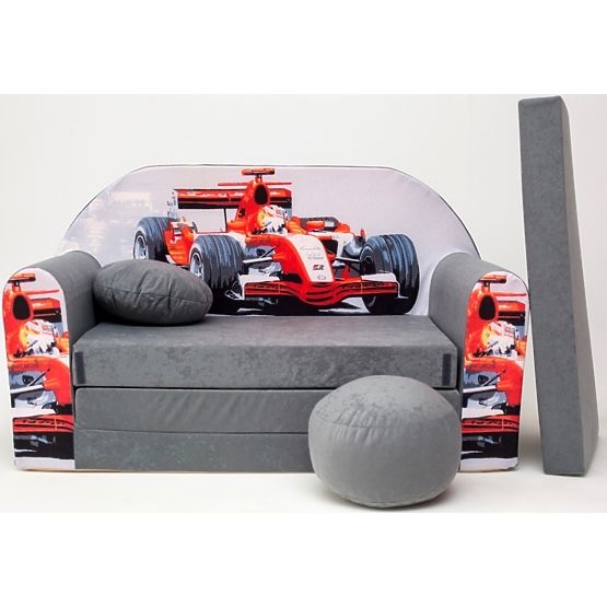 Il divano grigio per bambini con stampa di una formula rossa è perfetto sia per il riposo che per guardare cartoni animati o giocare. Il divano è leggero, quindi il bambino può spostarlo ovunque senza aiuto.