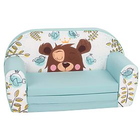 Divano turchese con orsacchiotto addormentato. Un simpatico divano adatto ai più piccoli. Il divano per bambini è realizzato in schiuma morbida e leggera. Ciò garantisce che sia sicuro e pratico per l'uso quotidiano.