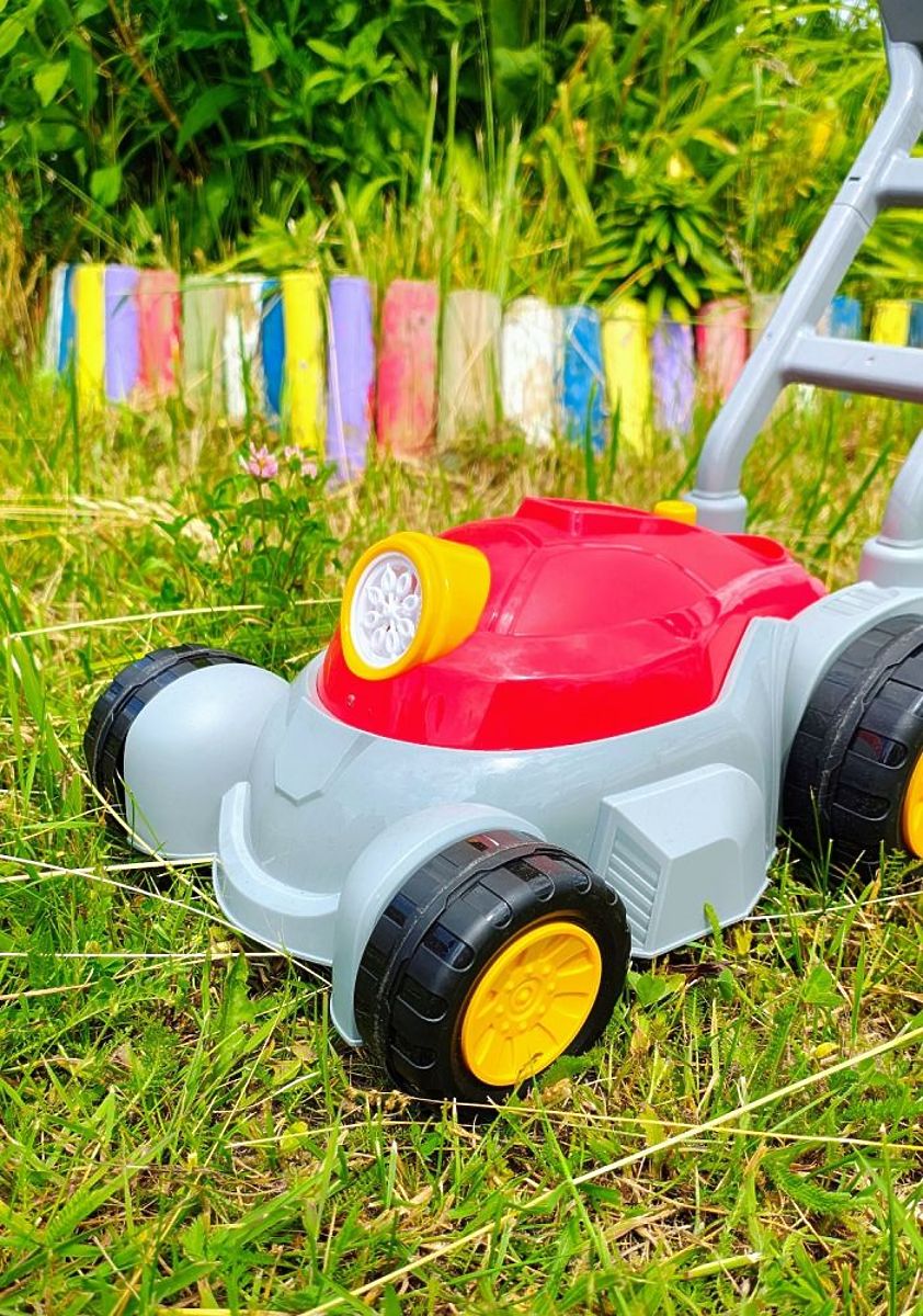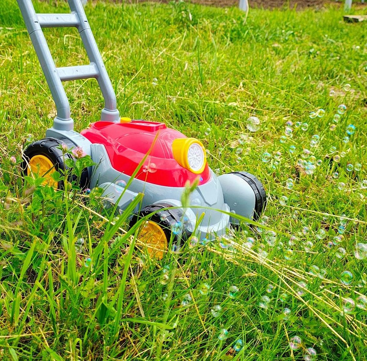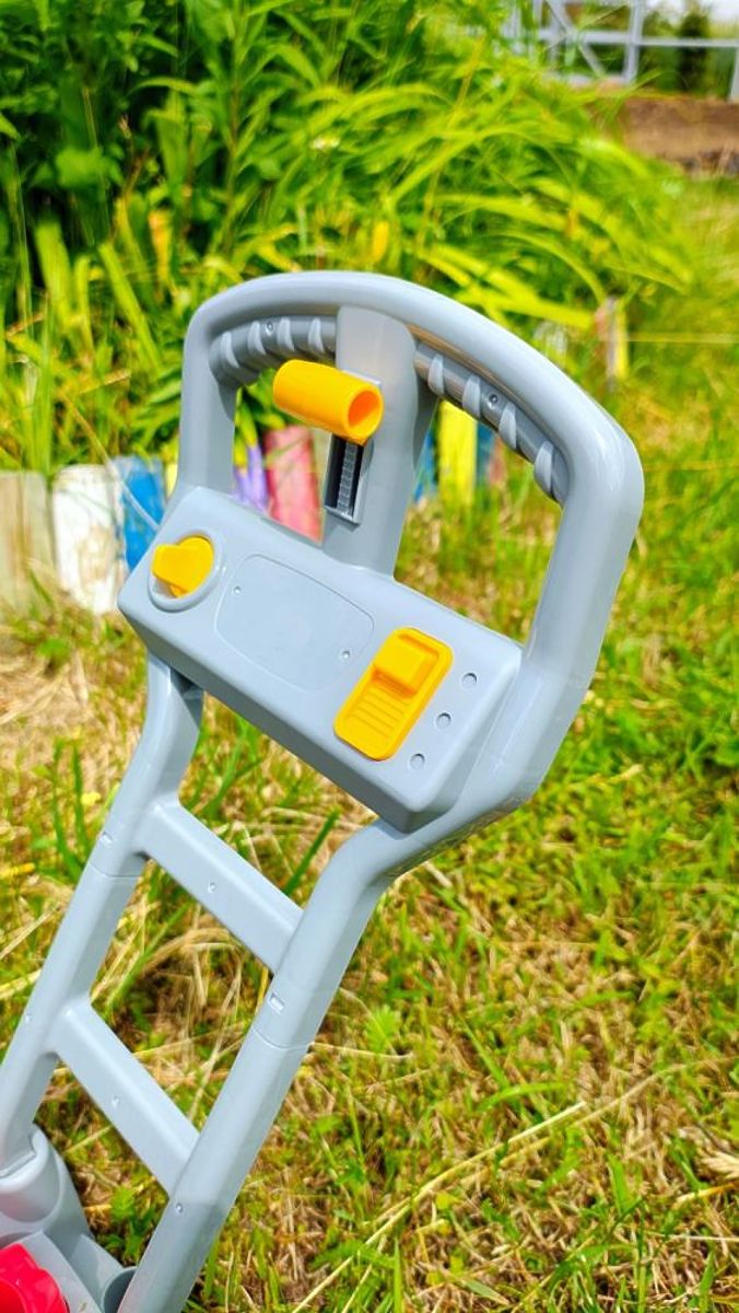Il tosaerba è molto facile da manovrare. Il set include anche un contenitore con liquido per bolle di sapone da 118 ml e un manico/impugnatura per il tosaerba. Il telaio del tosaerba è il cuore di questo prodotto. Qui si trova il meccanismo per il rilascio delle bolle. È necessario svitare il coperchio e inserire 3 batterie AA - indispensabili per avviare il meccanismo. Accanto si trova una filettatura con un tubo - qui è necessario avvitare la bottiglietta inclusa. Tranquilli! La bottiglietta è piena - se il liquido finisce, vi invitiamo ad acquistare una grande bottiglia di liquido di ricambio da 1,89 l, sufficiente per riempire 16 bottigliette. Resta solo da montare il manico e potete iniziare a "tagliare" il prato e non solo :)