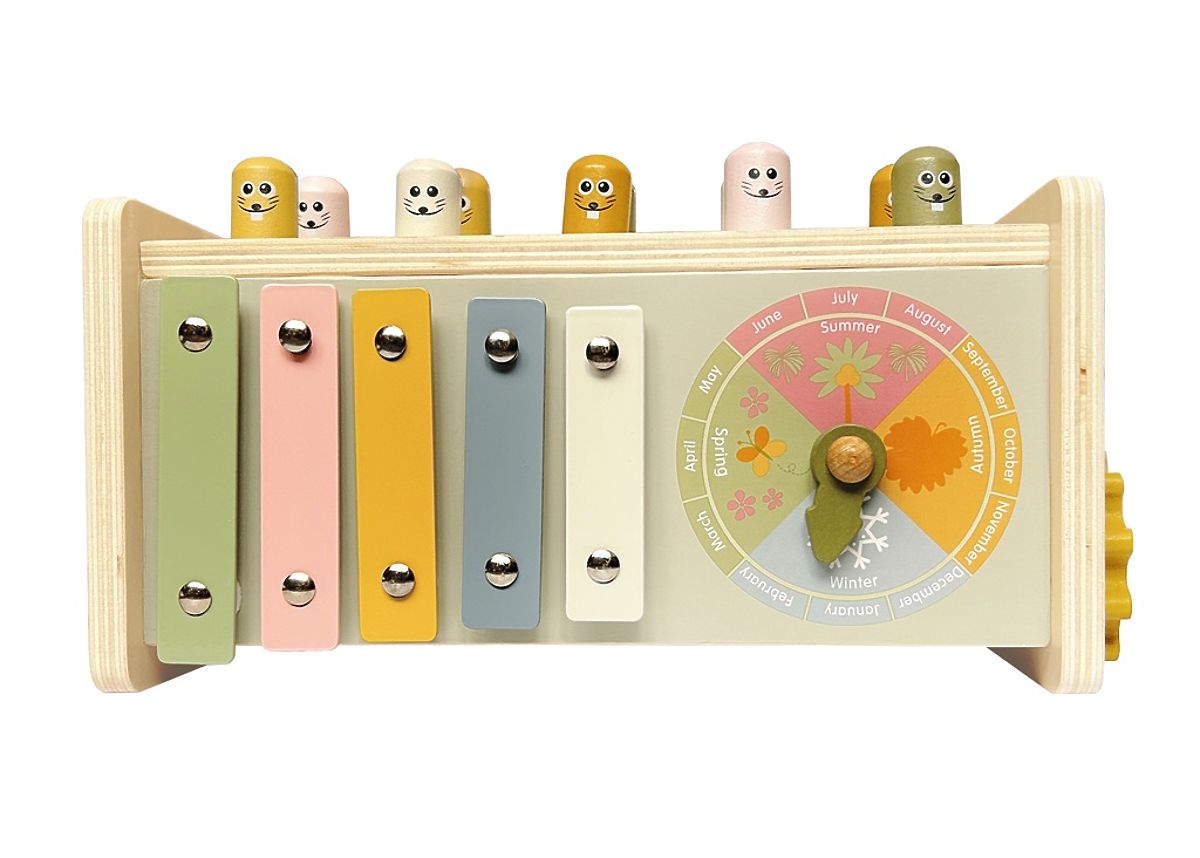 Martello, pesca di pesciolini, ingranaggi rotanti e eliche, labirinto scorrevole con pulcino, orologio con lancette... E questo non è tutto! Questo ricco giocattolo multifunzionale offre ai bambini una varietà di modi per giocare e allo stesso tempo sviluppare abilità importanti. Include un allegro martello con talpe e un martello di legno, con cui i bambini esercitano la forza del colpo e la precisione. La canna da pesca magnetica serve per catturare pesciolini colorati, aiutando a sviluppare pazienza, coordinazione e motricità fine. Non manca nemmeno uno xilofono colorato con bacchetta, che sviluppa l'udito musicale e il senso del ritmo. Grazie alle molte attività diverse, questo giocattolo in legno intrattiene i bambini per lungo tempo e stimola la loro curiosità, il pensiero logico e la percezione sensoriale. Tutto è realizzato in legno di qualità e sicuro, in colori pastello con motivi di animali. Lo xilofono non è uno strumento musicale, è solo un giocattolo. Caratteristiche principali: 8 pezzi gioco a martello, martello, canna da pesca, bacchetta giocattolo multifunzionale stimola la percezione, il pensiero logico e la percezione sensoriale supporta la motricità fine e la coordinazione mano-occhio adatto a bambini dai 2 anni