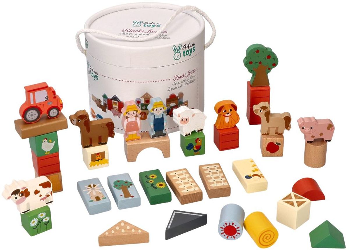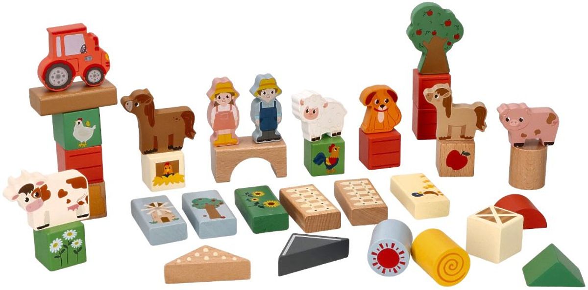 Costruisci la tua fattoria! Il piccolo contadino dovrebbe rimboccarsi le maniche, perché lo aspetta molto lavoro :) Gli animali non vedono l'ora di entrare nelle stalle e nei recinti che il piccolo costruttore creerà per loro grazie a questi colorati blocchi. Il grande set contenente 36 blocchi di legno di varie forme e dimensioni offre possibilità di costruzioni diversificate. I blocchi sono decorati con motivi della fattoria, creando un insieme armonioso e introducendo i bambini nel mondo degli animali rurali. Giocando, il bambino sviluppa la coordinazione mano-occhio e, raccontando ciò che vede, amplia il suo vocabolario.