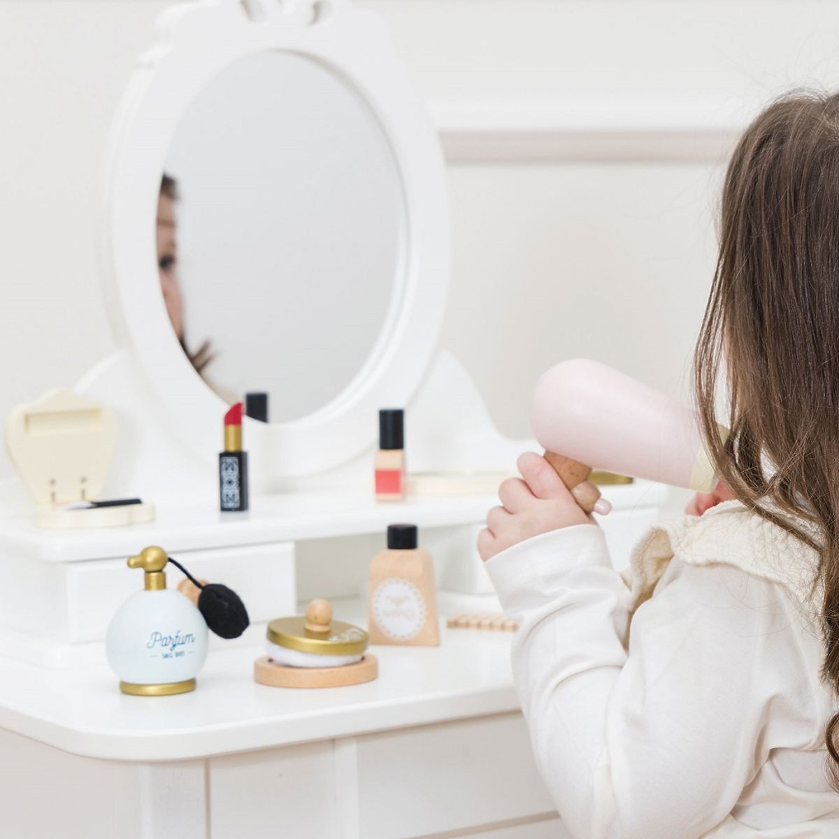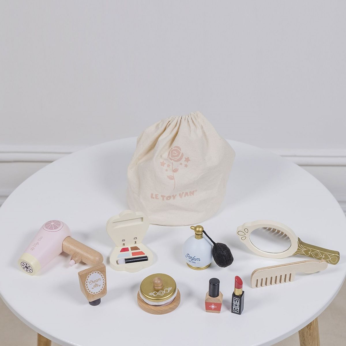 La borsa cosmetica è il sogno di ogni piccola truccatrice e costumista. All'interno troverete tutto il necessario per creare un trucco e un'acconciatura straordinari – crema, ombretti con applicatore, cipria con piumino, profumo, rossetto, asciugacapelli, pettine, specchietto, smalto per unghie e pennellino. Tutto è splendidamente riposto in un pratico sacchetto di tessuto, così da poter creare un trucco e un'acconciatura perfetti ovunque e in qualsiasi momento.