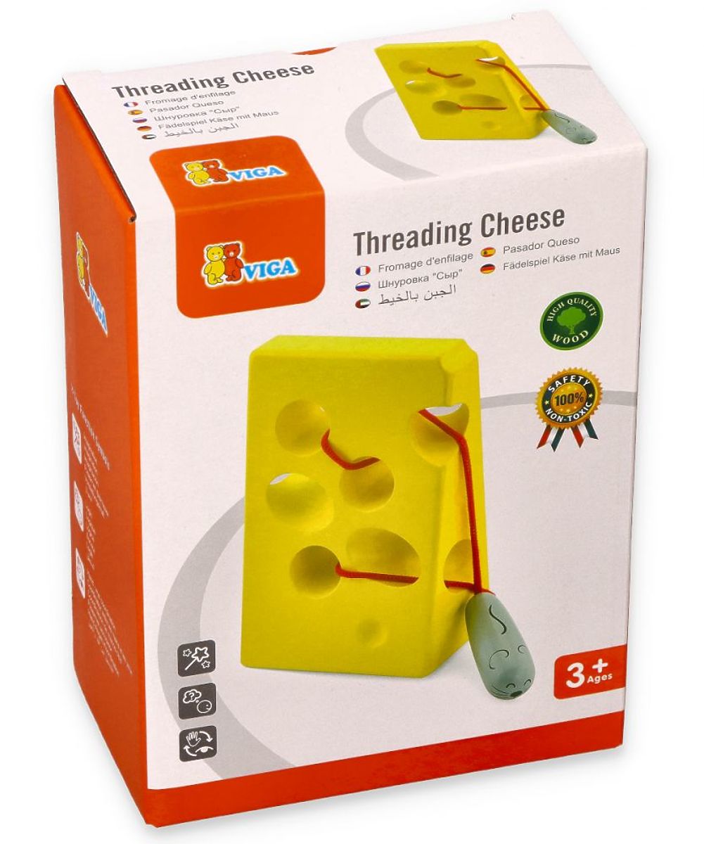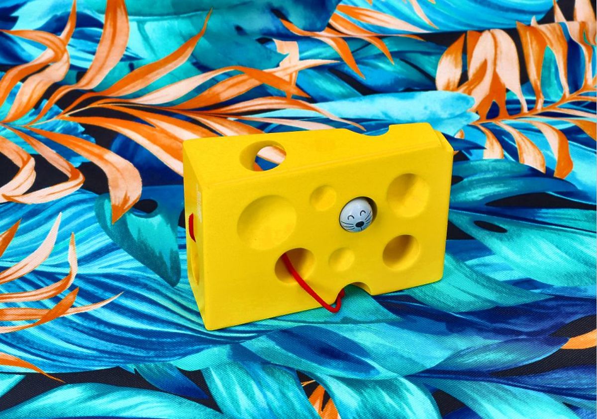 Guarda quanto piace questo formaggio al topolino. Il gioco consiste nell'intrecciare il topolino, al quale è attaccato un cordino, attraverso i fori predisposti nel formaggio.