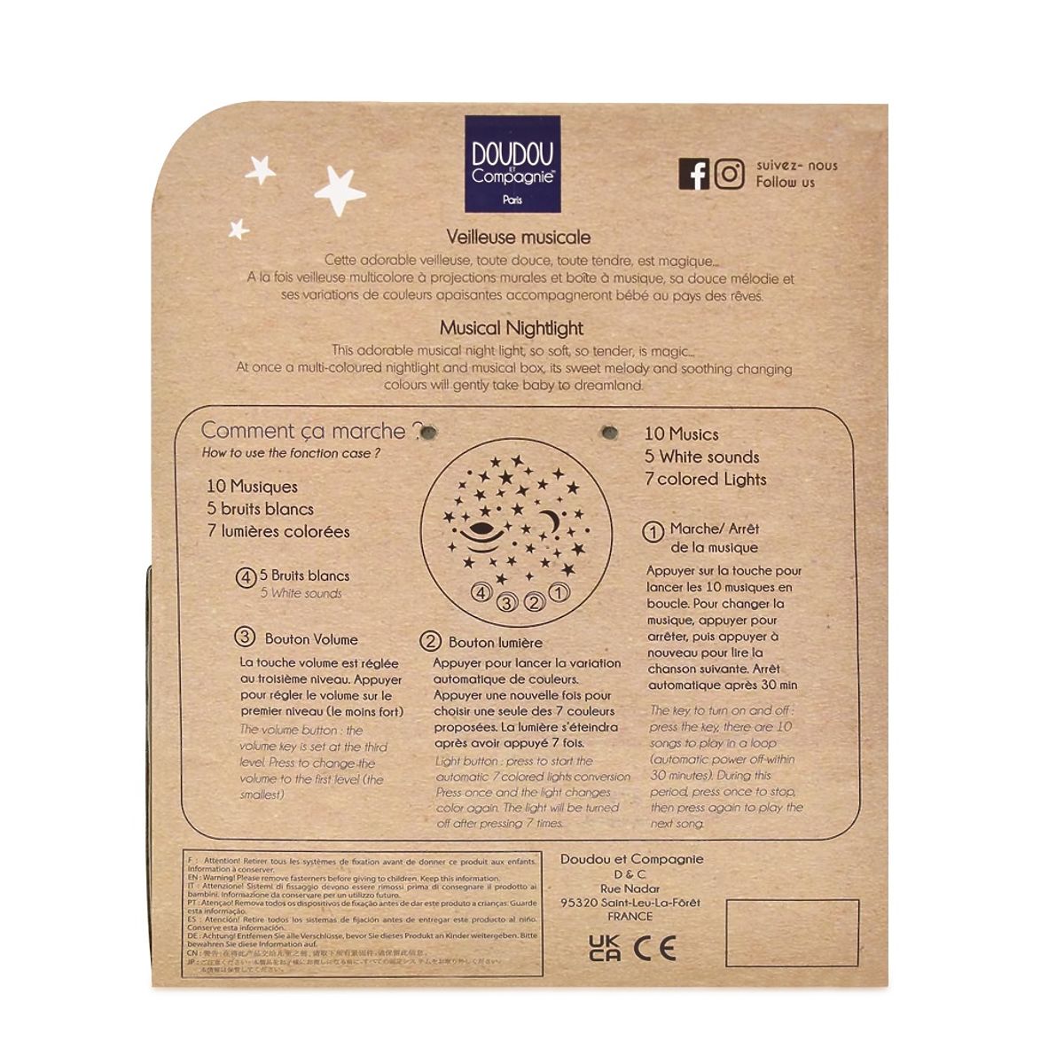 Chi non dorme ancora qui? Grazie a questo adorabile coniglietto, far addormentare il tuo bambino sarà un gioco da ragazzi. Il coniglietto, realizzato in un materiale morbido, è adatto per coccole e sul pancino ha un carillon con proiezione dell'universo in 7 colori. Riproduce 10 melodie delicate e 5 suoni rilassanti che culleranno il tuo bambino, favorendo il suo relax e un sonno di qualità. Tramite 4 pulsanti è possibile regolare il volume e i diversi modi di riproduzione delle melodie e le modalità di colore individuali. È possibile scegliere la modalità automatica, in cui le melodie vengono riprodotte ripetutamente, oppure selezionare un brano specifico. Allo stesso modo, puoi impostare la modalità automatica della luce, in cui i colori cambiano gradualmente, oppure scegliere il tuo colore preferito. La stimolazione visiva e uditiva aiuta lo sviluppo sensoriale del bambino. Questo carillon con proiezione è un bellissimo regalo per ogni bambino fin dalla nascita. Manutenzione: Lava il coniglietto in un bagno a 30° (rimuovi il meccanismo musicale prima del lavaggio). Asciuga naturalmente o a bassa temperatura. Caratteristiche principali: peluche e carillon con proiezione in uno, il carillon è removibile per una facile manutenzione, stimolazione visiva e sensoriale, morbido peluche, conforme alle norme europee CE, adatto come regalo o accessorio per la cameretta dei bambini, alimentato da 3 batterie AAA/R03 (non incluse) dalla nascita.