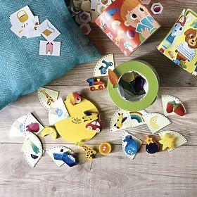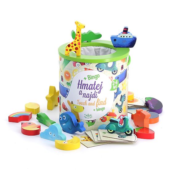L'insuperabile bestseller Vilac cerca di sviluppare in modo originale il senso del tatto spesso trascurato dei bambini. Il gioco è composto principalmente da figure di legno nascoste in un secchiello dotato all'interno di un morbido sacchetto di stoffa. Dopo aver messo la mano nel tubo, i bambini più piccoli hanno il compito di descrivere con parole proprie quale oggetto tengono in mano, basandosi sul sentirsi soli. I genitori possono dimostrare la procedura ai propri figli con un esempio illustrativo. I bambini più grandi possono giocare sotto forma di lotto o bingo, per questi giochi nel set sono disponibili carte illustrate con i singoli oggetti. Caratteristiche principali: 21 pezzi di gioco e 20 carte illustrate per 2-5 giocatori diverse varianti di gioco confezione pratica Istruzioni del gioco: Tocca e trova: il primo giocatore prende una carta dal mazzo. Poi devono frugare nella borsa e toccare il pezzo di legno che corrisponde all'immagine sulla carta. Se sceglie la pedina corretta, tiene la carta e tocca al giocatore successivo, che ricomincia pescando una carta dal mazzo. Ma se il primo giocatore sceglie la tessera sbagliata, deve passare la sua carta al giocatore successivo, che deve cercare di trovare la tessera corretta. Dopo ogni giro, i pezzi vengono rimessi nel sacchetto. Quando non ci sono più carte nel mazzo, si determina il vincitore. Vince il giocatore con il maggior numero di carte. Attenzione! Se uno dei giocatori pesca accidentalmente una pedina a forma di bomba, deve rimettere tutte le sue carte nel mazzo! Puoi modificare le regole come meglio credi per aiutare i bambini a familiarizzare con il sentire e la ricerca degli oggetti: 1 – Inizia con una piccola quantità di pezzi di legno. 2 – Lascia che i bambini guardino nel sacchetto. 3 – Allora rendi di nuovo il gioco un po' più difficile, non lasciare che guardino nel sacchetto. 4 – Aggiungi altri pezzi al sacchetto. 5 – Infine, quando i bambini si saranno abituati al gioco, giocate secondo le regole tradizionali. Variante BINGO: Disporre 4 carte in un quadrato e creare uno o più campi da gioco per ogni giocatore. Uno dei giocatori o un genitore prende una pedina dal sacchetto e la dichiara. Il giocatore che ha una carta corrispondente a questo pezzo evocato la prende e la piazza sulla sua carta. Vince il primo giocatore che riempie il proprio campo di gioco! Documentazione: Guida al gioco Touch and Find (CZ) Guida al gioco Touch and Find (SK)