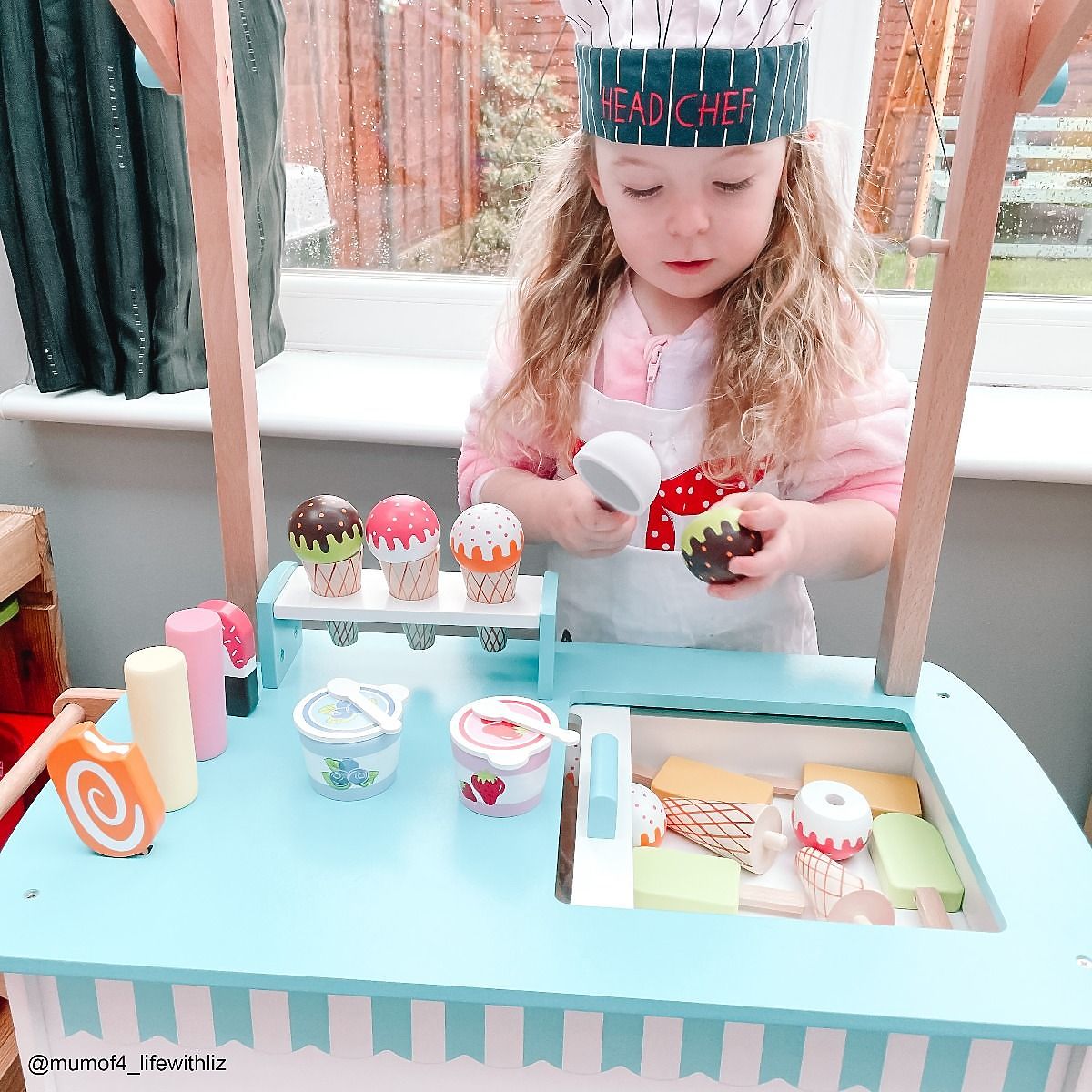 Servite deliziosi gelati ad amici e familiari... Questo carretto dei gelati in legno di alta qualità viene fornito con 6 gelati, 9 ghiaccioli, 2 coppette di gelato con cucchiaini e un porzionatore di gelato. Queste dolci prelibatezze sono il complemento perfetto per il gioco. Un ottimo modo per incoraggiare il gioco di ruolo creativo e fantasioso. Realizzato con materiali di alta qualità e provenienti da fonti responsabili. Soddisfa le attuali norme di sicurezza europee. Caratteristiche principali: carretto dei gelati in legno completo di 6 gelati, 9 ghiaccioli, 2 coppette di gelato con cucchiaini e un porzionatore di gelato, aiuta a sviluppare il vocabolario durante la vendita e il servizio di gelato ai propri amici.