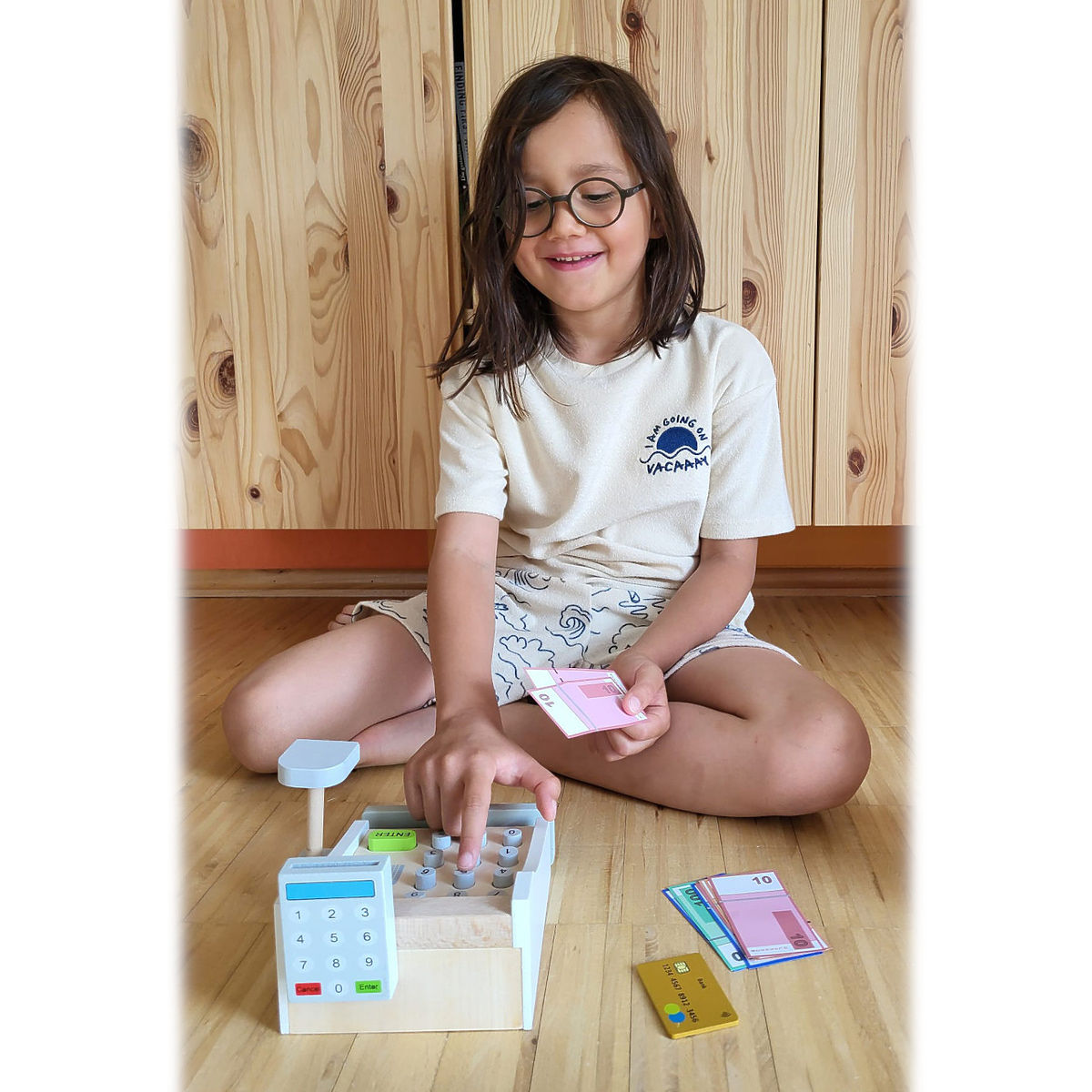 I soldi continuano ad arrivare! Questo bellissimo registratore di cassa in legno non può mancare in ogni negozio per bambini ben organizzato. Giocare con questo giocattolo aiuta i bambini a comprendere i prezzi delle merci e a maneggiare il denaro. I componenti sono note di gioco e carte di credito in legno che stanno comodamente nel cassetto inferiore. Il prezzo della merce acquistata può essere inserito tramite tastiera. Chi è il prossimo?