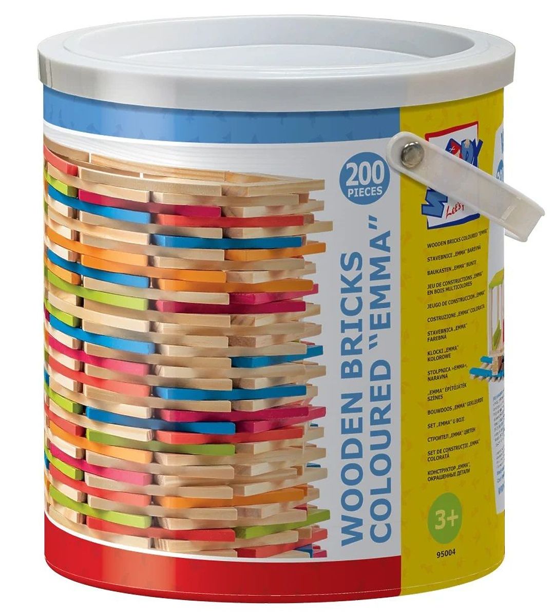 Il set contiene in totale fino a 200 blocchi. La maggior parte è di colore naturale, ma per variare il set include anche 10 blocchi in colori: arancione, rosa, rosso, blu e verde. Tutto è confezionato in un pratico secchio con manico.