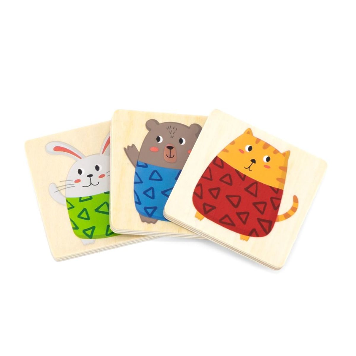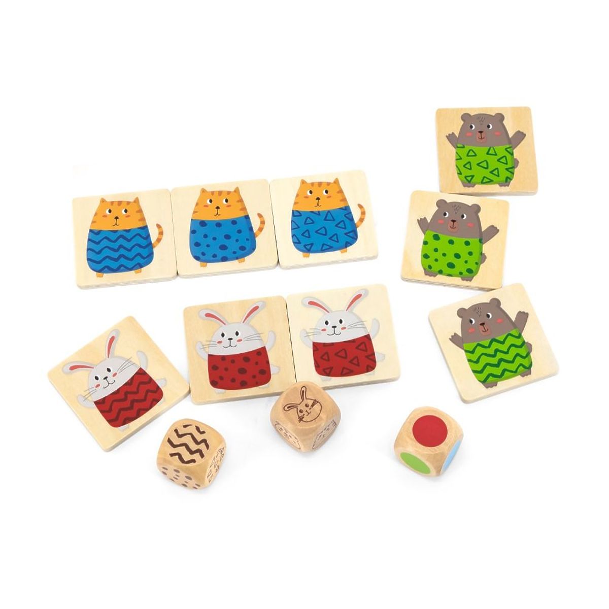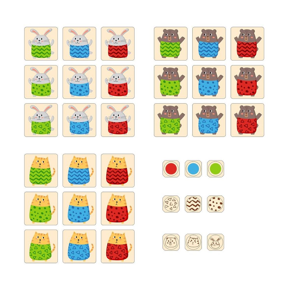Variante 3 (difficile) - lancia tutti i dadi e poi individua e seleziona l'unico elemento del puzzle corrispondente, ad esempio gatto blu con strisce, coniglio verde con puntini o orso rosso con triangoli. In questa variante, hai solo 1 elemento possibile da raccogliere per lancio.