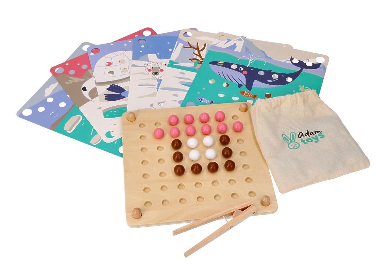 Un'altra fantastica offerta dal noto produttore di giocattoli Adam Toys. Questa volta si tratta di un puzzle di abilità con nuovi eroi artici. Il set è composto da una base di legno con fori perforati, 6 tavole colorate con animali della serie e 71 palline colorate e pinze di legno.