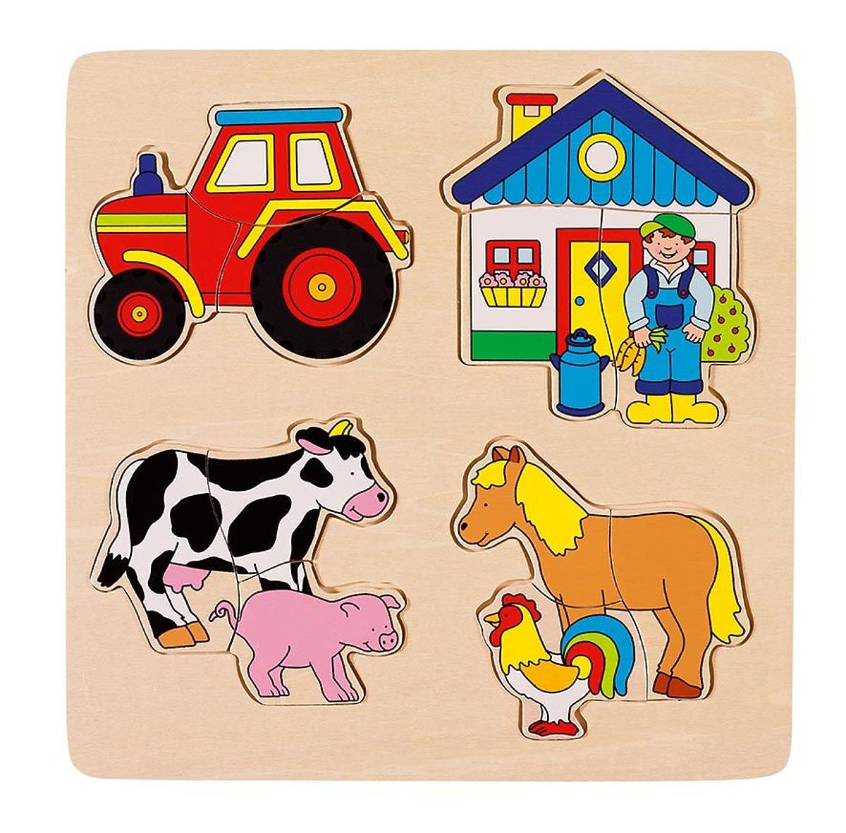 Nel set troverete una base e 12 pezzi di forma irregolare. Il set permette di comporre quattro immagini della vita in fattoria. Troverete un trattore, un allegro fattore davanti alla sua casa, una mucca e un maialino, e un cavallo con un gallo.