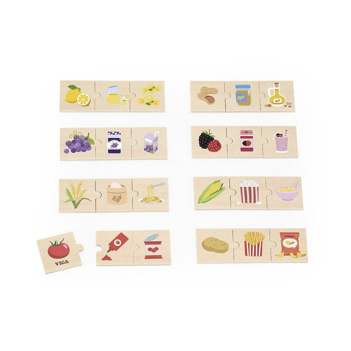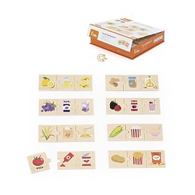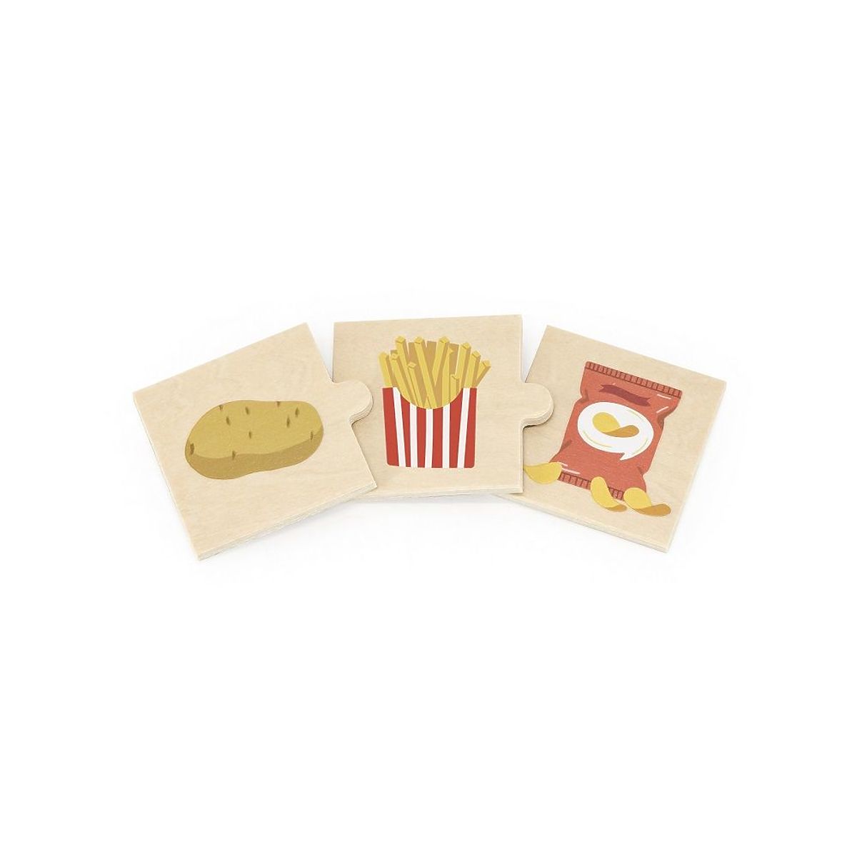 Un puzzle in legno insegna ai bambini più piccoli la relazione tra gli alimenti e le colture da cui provengono. Abbinando frutta, verdura e raccolti a prodotti come popcorn, cereali, burro di arachidi o pasta, i bambini scoprono l'origine di queste prelibatezze quotidiane. Questo tipo di gioco sviluppa la comprensione dei processi legati alla produzione alimentare e incoraggia la conoscenza delle fasi di lavorazione delle colture. Il puzzle insegna concentrazione e abilità motorie.