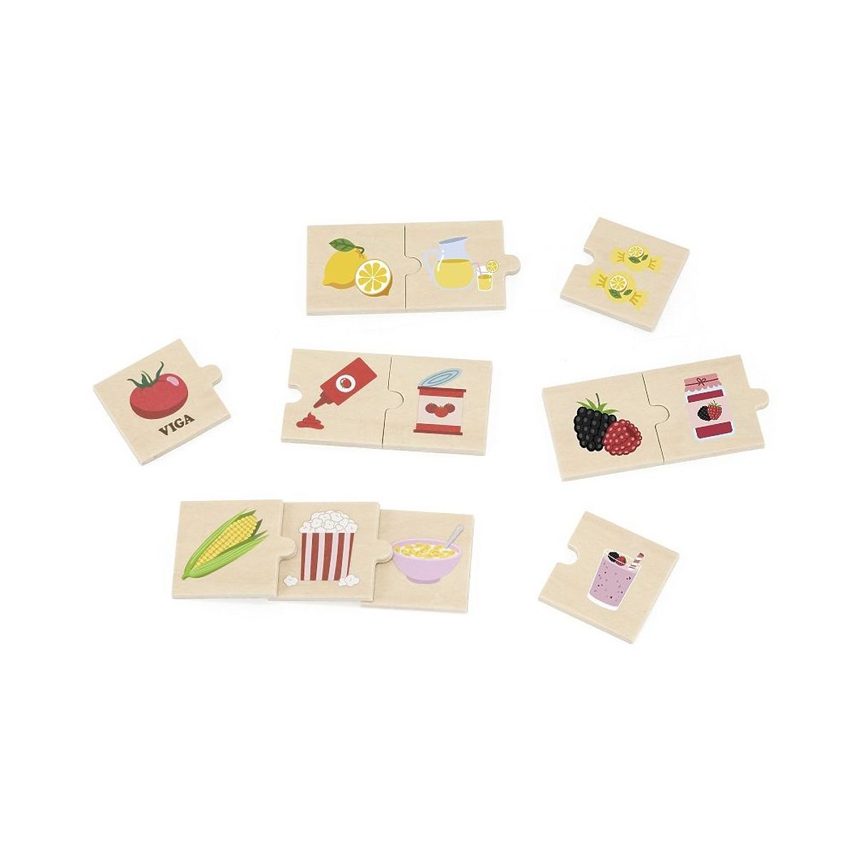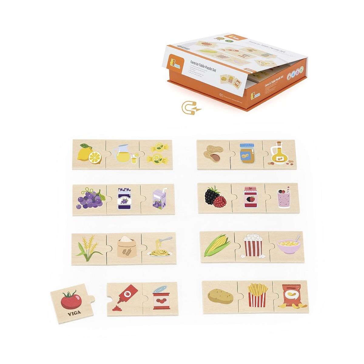 Un puzzle in legno insegna ai bambini più piccoli la relazione tra gli alimenti e le colture da cui provengono. Abbinando frutta, verdura e raccolti a prodotti .. altro