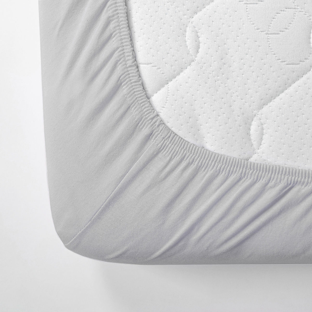 Lenzuolo con angoli in cotone di colore grigio. Il lenzuolo è tessuto con filati di cotone di alta qualità, motivo per cui mantiene le sue proprietà anche dopo ripetuti lavaggi.