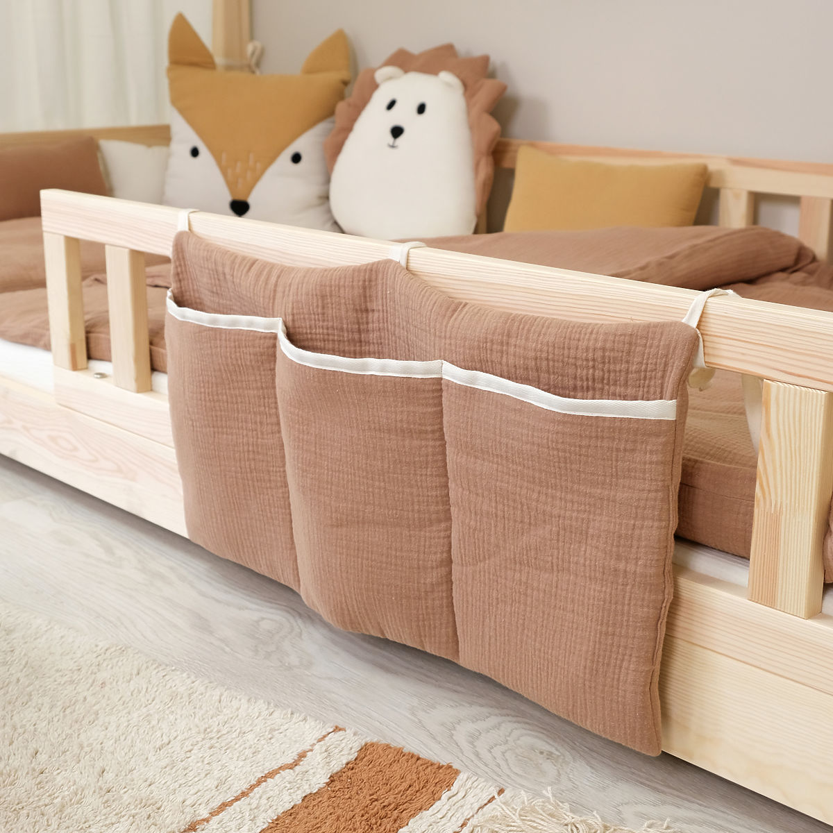 Semplifica l'organizzazione quotidiana e l'ordine nella cameretta dei bambini con l'elegante e pratico tasca in mussola Ourbaby in un elegante colore toffee. Questo accessorio unico è realizzato in mussola di alta qualità e traspirante, che è delicato sulla pelle sensibile dei bambini.