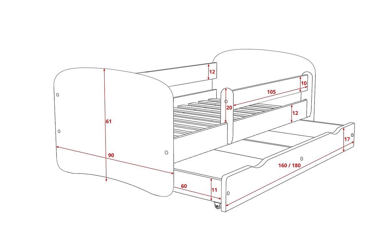 Součástí balení je postel, zábrana a rošt. Délka zábrany je 100 cm. Matrace není součástí postele. Můžete si ji objednat zvlášť v naší sekci matrace.