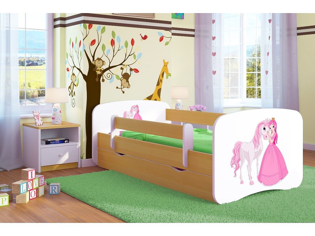 Krásná dětská postel Ourbaby s princeznou a jejím koníčkem! Postel se vyznačuje funkčností, komfortem, dětským designem a snadnou montáží. Je vyrobena z lamino desky, rošt z borovicového dřeva (4 cmx2 cm), a proto postel zvládne nosnost do 120 kg.