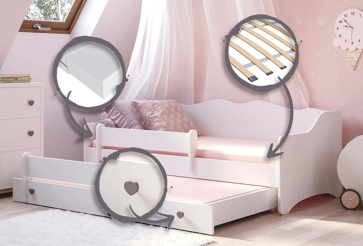 Il letto Emma si distingue per la sua funzionalità, apprezzata sia dai bambini che dai loro genitori. Grazie alla solida struttura in pannello di mobili certificato, il letto può sostenere un carico fino a 110 kg, garantendo un uso a lungo termine. La sicurezza del bambino è garantita da bordi arrotondati e barriere protettive rimovibili, facilmente adattabili alle esigenze del bambino. La rete FLEX con doghe elastiche garantisce un sonno comodo e confortevole. Inoltre, il letto inferiore, anche se non destinato a riporre oggetti, può fornire un luogo comodo e sicuro per dormire per un secondo bambino, risparmiando spazio nella stanza.