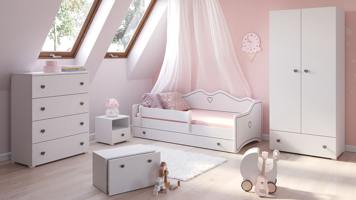 La funzionalità del modello EMMA è sottolineata da una serie di soluzioni pratiche che facilitano la vita quotidiana. Il letto è dotato di un ampio cassetto su ruote, ideale per riporre biancheria da letto, giocattoli, giochi o altri oggetti, aiutando a mantenere l'ordine nella cameretta. Un ulteriore vantaggio è la barriera protettiva mobile, che può essere montata su qualsiasi lato del letto, aumentando la sua versatilità e sicurezza. La struttura del letto può sopportare un carico fino a 110 kg, quindi può servire per molti anni. L'uso di doghe a molle nel sistema FLEX garantisce un supporto ottimale del corpo, influenzando la qualità del sonno. Inoltre, la testiera alta consente al letto di fungere da comodo divano durante il giorno, ideale per leggere, giocare o rilassarsi. Questa soluzione multifunzionale è adatta sia per stanze più piccole che più grandi e soddisfa pienamente le esigenze dei bambini e dei loro genitori.