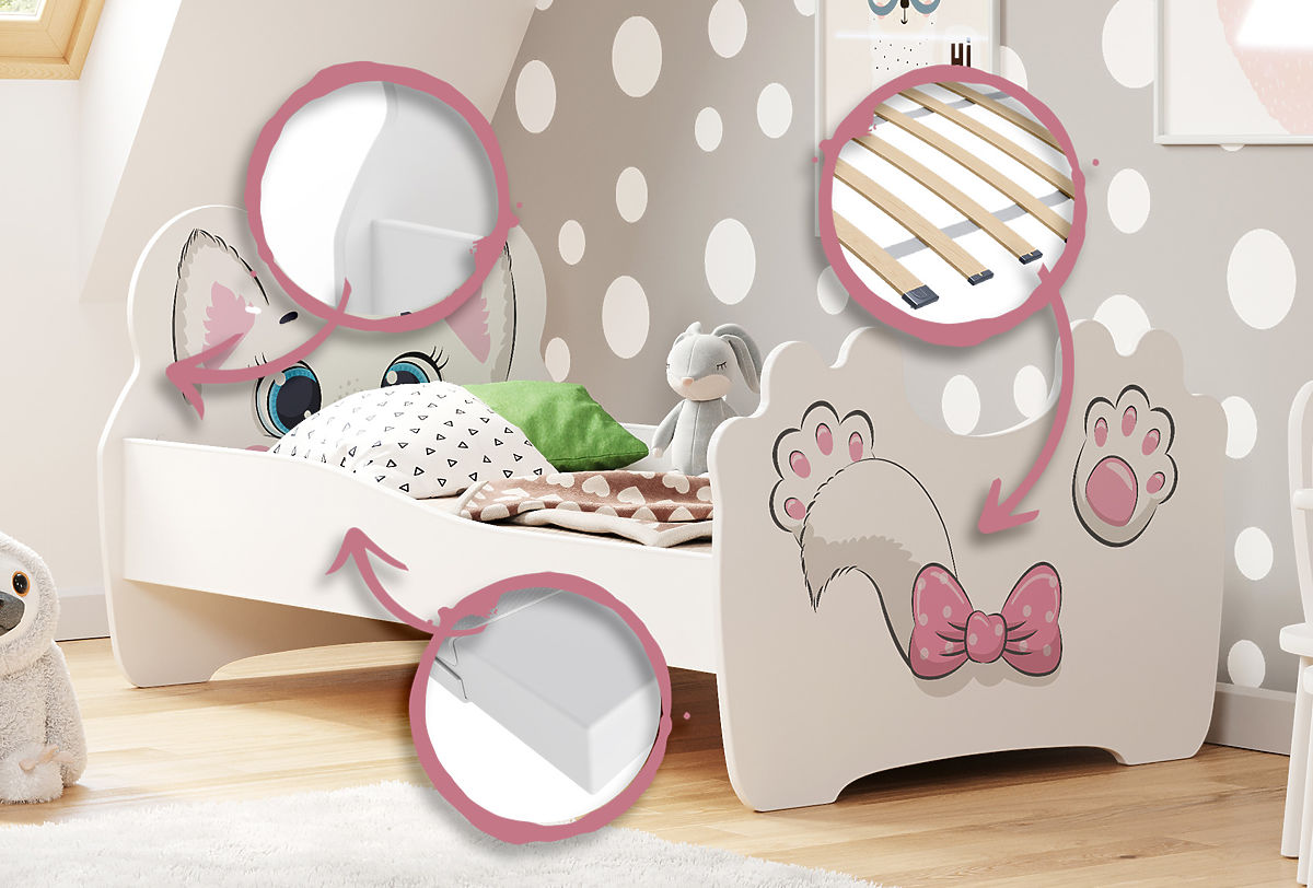 Il letto per bambini con una deliziosa stampa di un gattino rosa è la soluzione perfetta per una piccola amante dei motivi fiabeschi. Il grazioso motivo sulla testiera e sulla pediera rende il mobile non solo un luogo per dormire, ma anche un'eccezionale decorazione per la stanza dei bambini. I colori tenui e il motivo fiabesco portano un'atmosfera gioiosa all'interno, che favorisce sia il riposo che il gioco creativo.