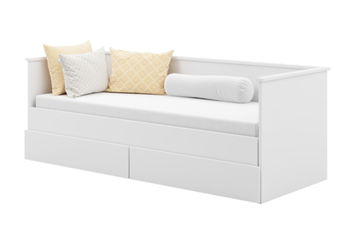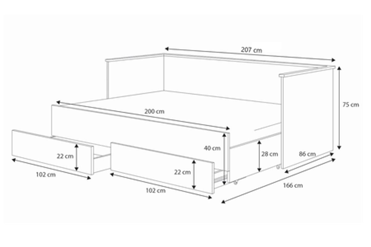 Il modello HELIOS non è solo un comodo posto per dormire, ma anche una soluzione pratica per l'uso quotidiano. Grazie ai cassetti spaziosi con guide a sfera, riporre biancheria da letto, vestiti o piccoli oggetti è molto facile, permettendo di mantenere l'ordine nella stanza. Una volta chiuso, il letto funge da elegante e comodo divano, ideale per rilassarsi durante il giorno o accogliere ospiti. La solida struttura in pannelli di mobili di alta qualità con uno spessore di 18 mm garantisce resistenza e stabilità, mentre le doghe in betulla del telaio forniscono il giusto supporto al materasso, assicurando un sonno confortevole ogni notte.