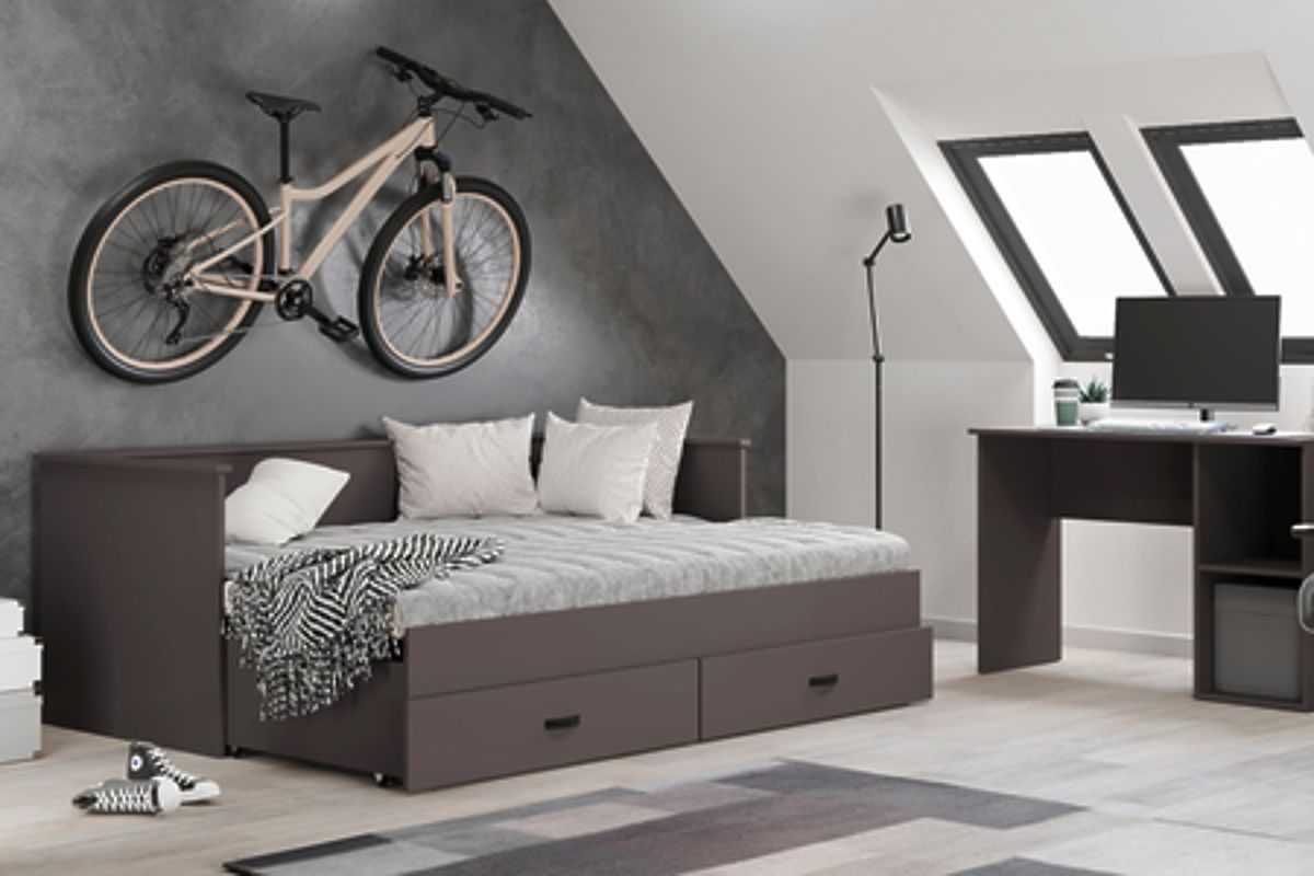 Il modello HELIOS è una soluzione creata con attenzione alla funzionalità e all'estetica. Una volta chiuso, il letto funge da comodo divano, risparmiando spazio e creando un ambiente accogliente durante il giorno. Due spaziosi cassetti su guide a sfera permettono di riporre biancheria da letto, abbigliamento o altri piccoli oggetti, aiutando a mantenere l'ordine nella stanza. La struttura in robusto pannello di mobili di 18 mm di spessore e il telaio in doghe di betulla garantiscono stabilità, durata e comfort d'uso. Questa variante consente la scelta dei materassi secondo le proprie preferenze, in modo che ciascuno possa adattarli alle proprie esigenze individuali.