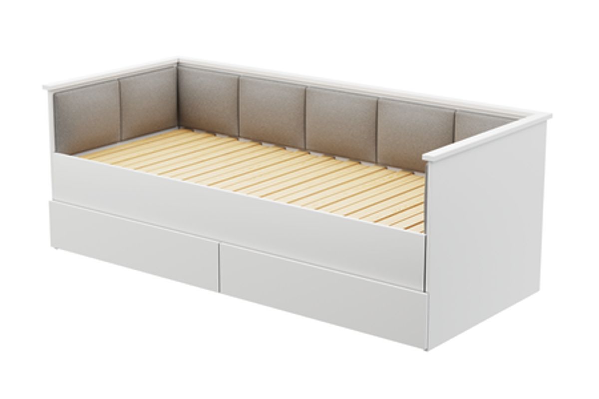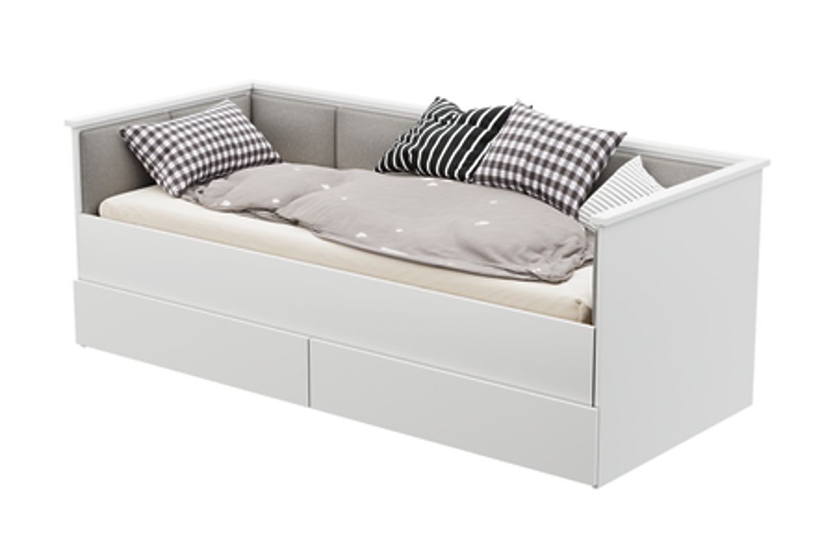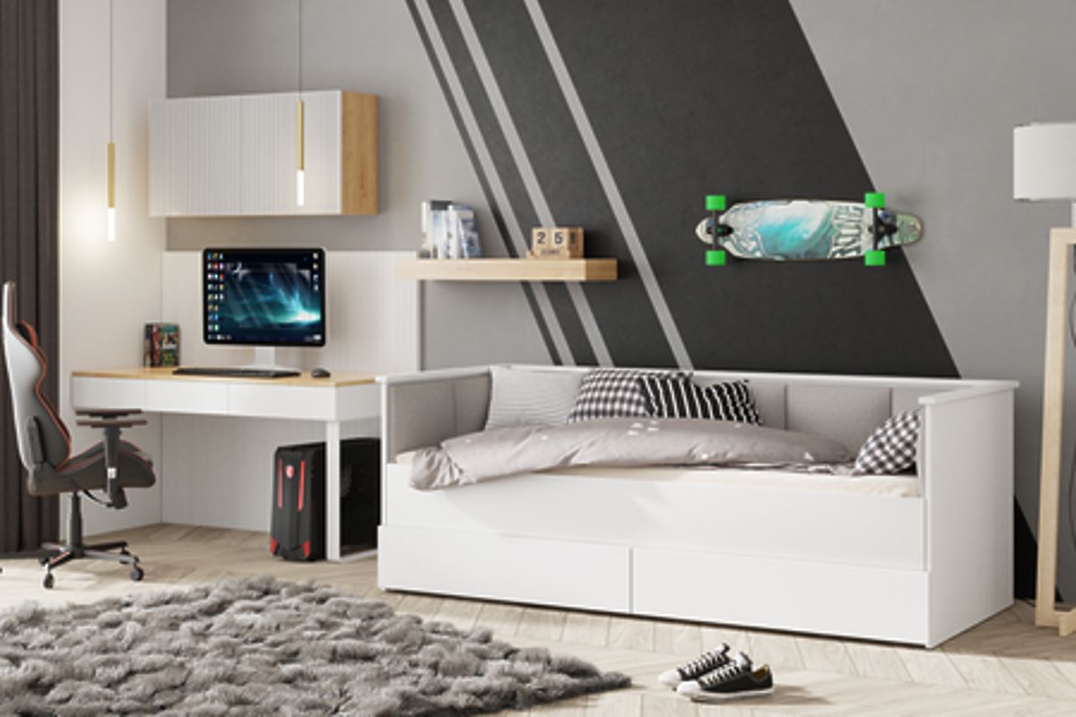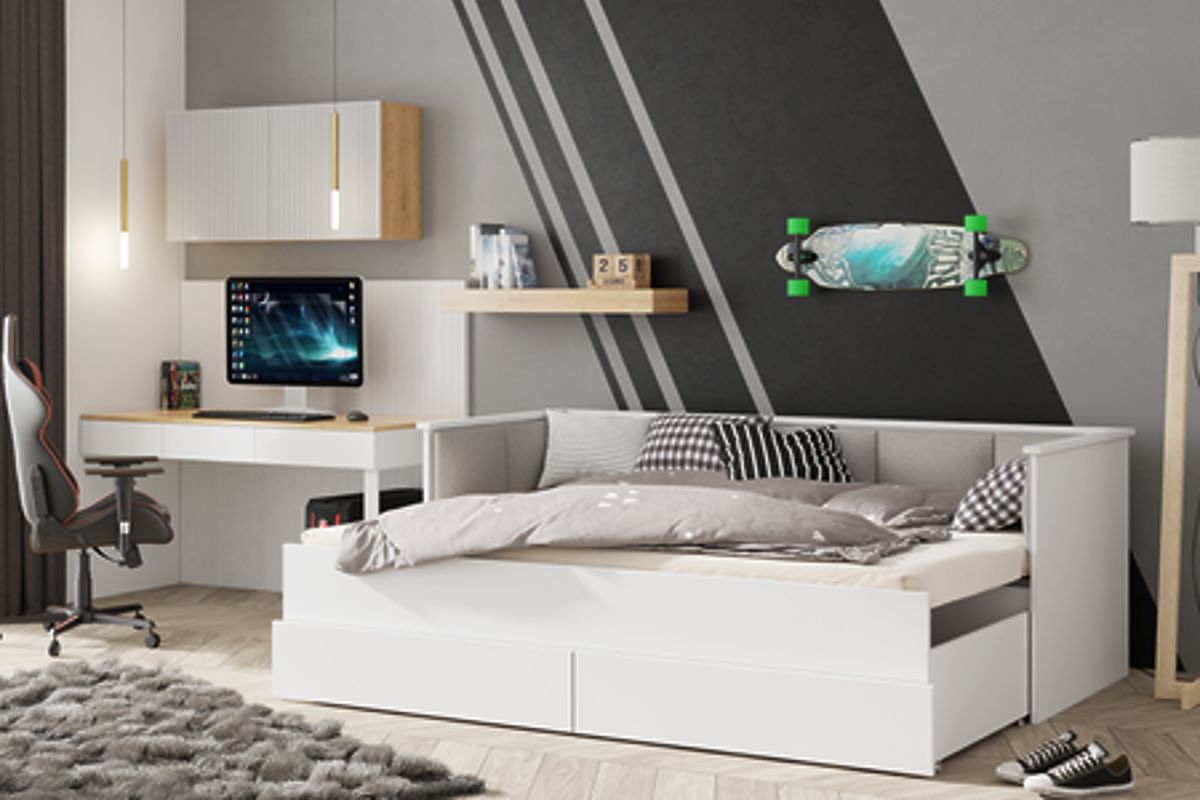 Il design minimalista del letto HELIOS, arricchito da pannelli imbottiti in materiale di alta qualità tipo velluto, conferisce all'interno un carattere moderno ed elegante. I pannelli non sono solo un complemento estetico, ma anche un elemento pratico che garantisce un comodo supporto durante la lettura, la visione della TV o lo studio. Il materiale morbido e piacevole al tatto aggiunge calore e accoglienza, sottolineando il carattere amichevole della stanza per giovani. Inoltre, il letto è dotato di due ampi cassetti su guide a sfera che permettono di riporre biancheria da letto, vestiti o altri piccoli oggetti. Questa soluzione non solo aiuta a mantenere l'ordine, ma ottimizza anche l'uso dello spazio, particolarmente importante nelle stanze più piccole.