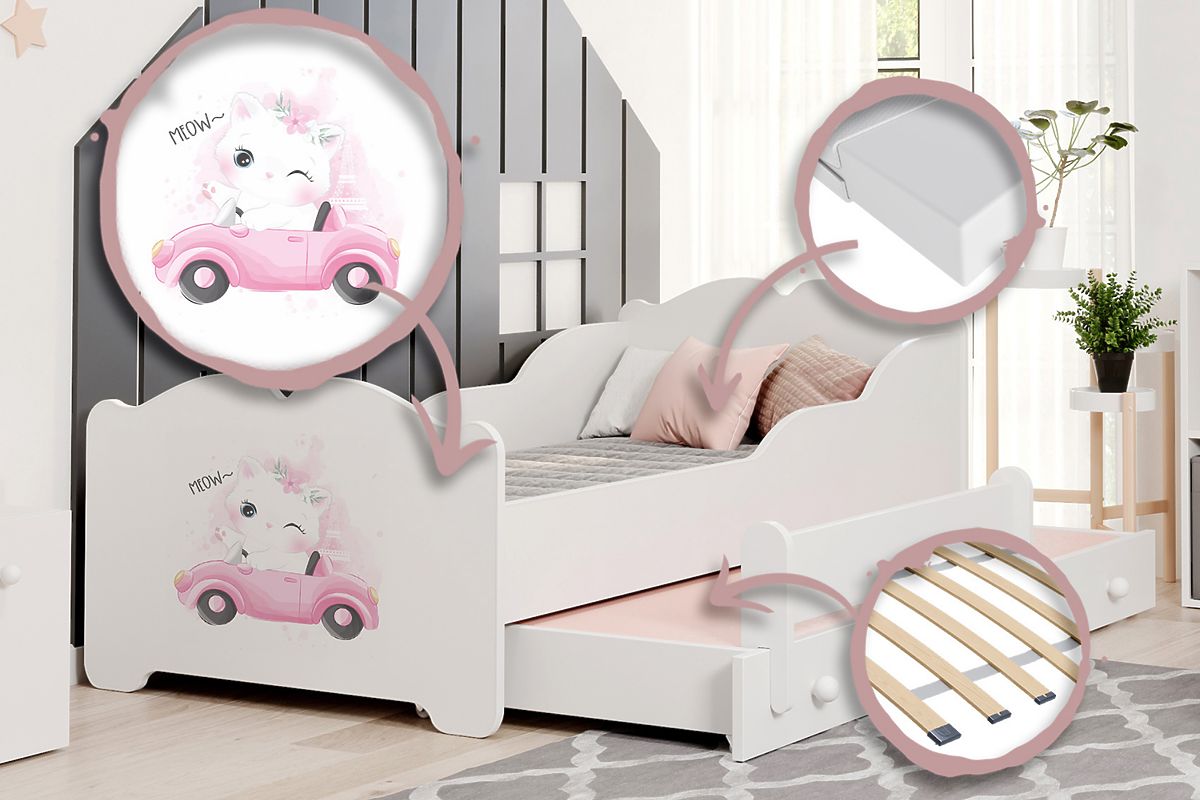 Letto Anna bianco con stampa gatto, comfort e sicurezza per la stanza delle ragazze. .. altro