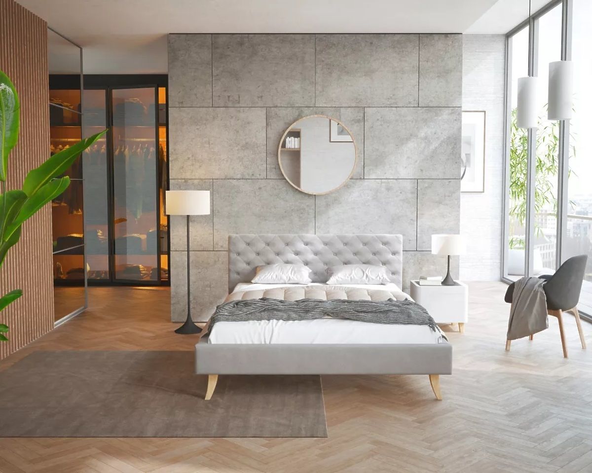 Il materiale di rivestimento del letto imbottito è tessuto vellutato grigio Trinity. Si distingue per la sua struttura fine e allo stesso tempo per l'alta resistenza anche alla luce solare. È morbido, soffice e piacevole al tatto. Inoltre, è molto resistente all'usura e al pilling. Vi colpirà con il suo aspetto moderno e le cuciture decorative della testiera del letto.