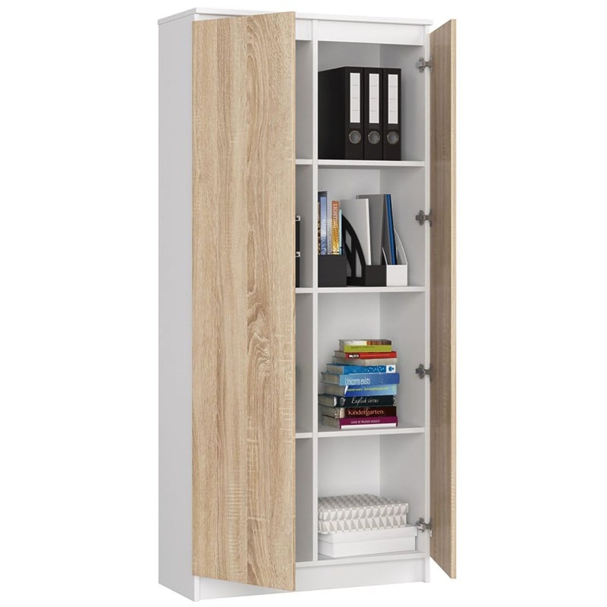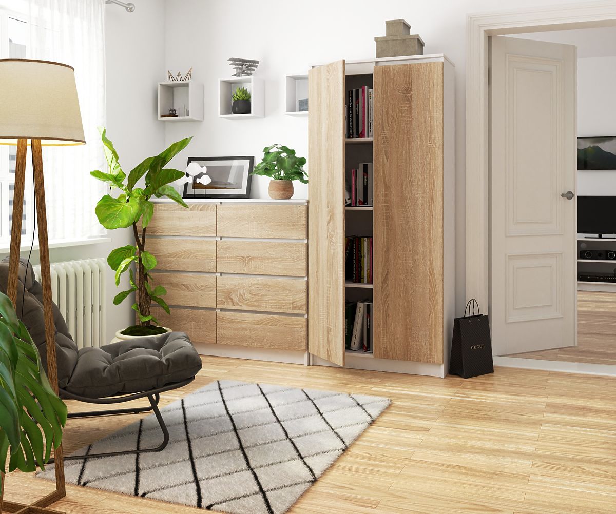 L'armadio ufficio R 80 cm Clip 2 è un mobile nei colori bianco/sonoma, una delle tonalità più popolari di questa stagione. Questa libreria porterà ordine e armonia nel tuo ufficio. È dotata di otto spaziosi ripiani dove riporre tutto il necessario per l'ufficio. Inoltre, i suoi bordi sono rivestiti con bordo ABS, che offre un'elevata protezione contro i danni. Tra i vantaggi di questa libreria ci sono: