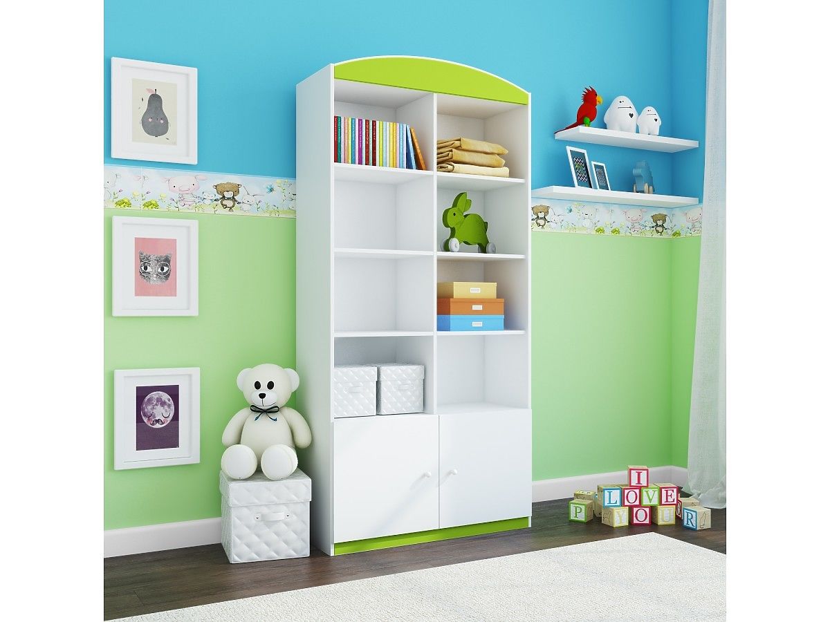 Jde o krásný doplněk do dětského pokojíčku, který ho nejen prakticky doplní, ale také zkrášlí a vydekoruje. Policový regál s dvířkami v zelené barvě se hodí do všech interiérů, je skvělý pro kluky i pro holky.