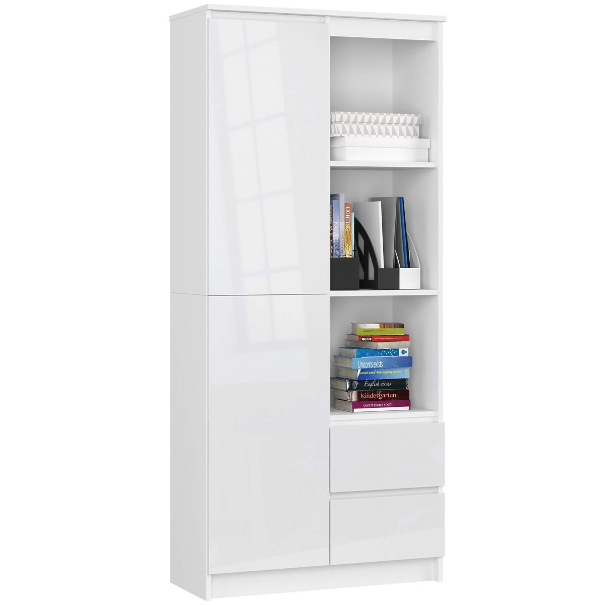 Scaffale da ufficio con ante e cassetti in colore bianco e superfici frontali in bianco lucido.