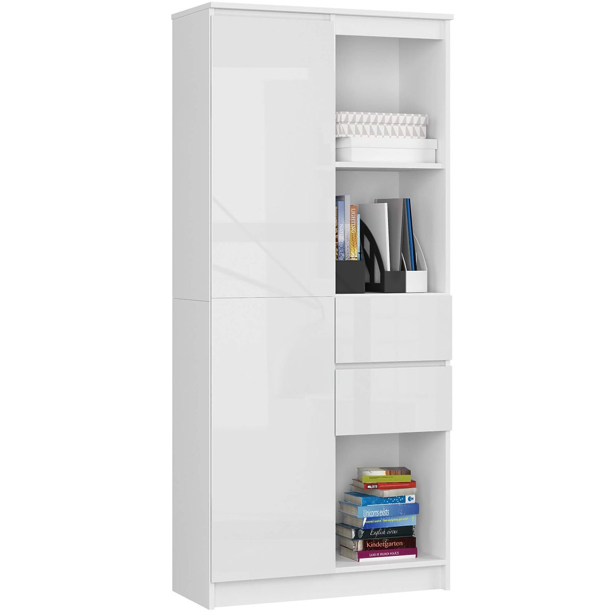 Scaffale bianco da ufficio della serie CLP R-15 con superfici frontali in lucido bianco