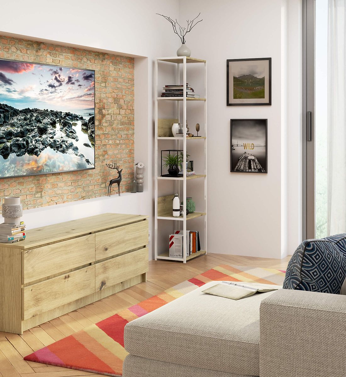 - aspetto elegante: lo scaffale si distingue per la sua forma semplice, il telaio è di colore bianco, mentre il piano è nel colore rovere artisan,