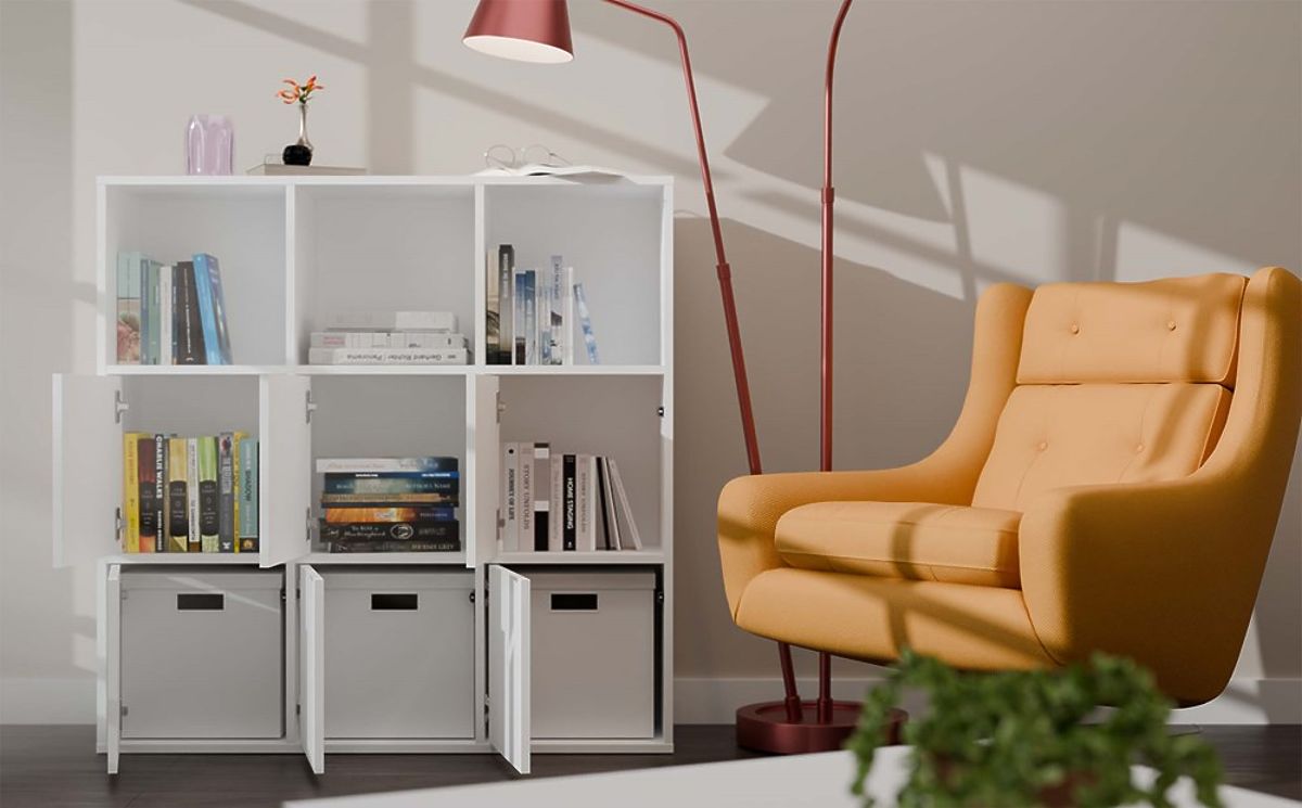 Scaffale modulare bianco opaco con 9 scomparti e 3 ante. .. altro