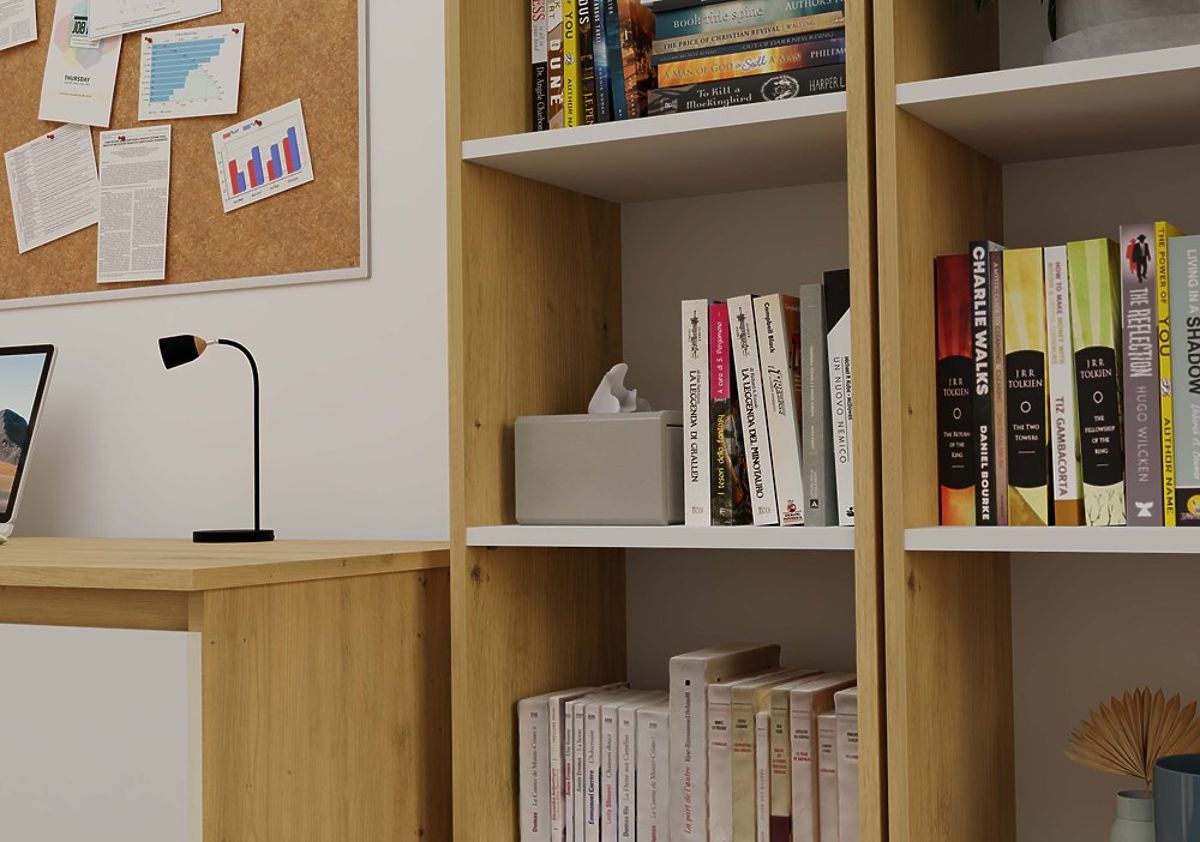 Scaffale R40 con ripiani bianchi e rovere per libri e decorazioni. .. altro