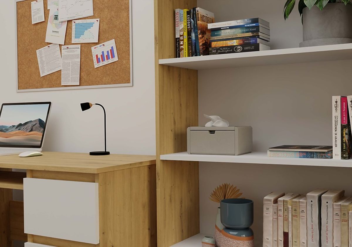 Scaffale R80 con mensole bianche e rovere per libri e decorazioni. .. altro