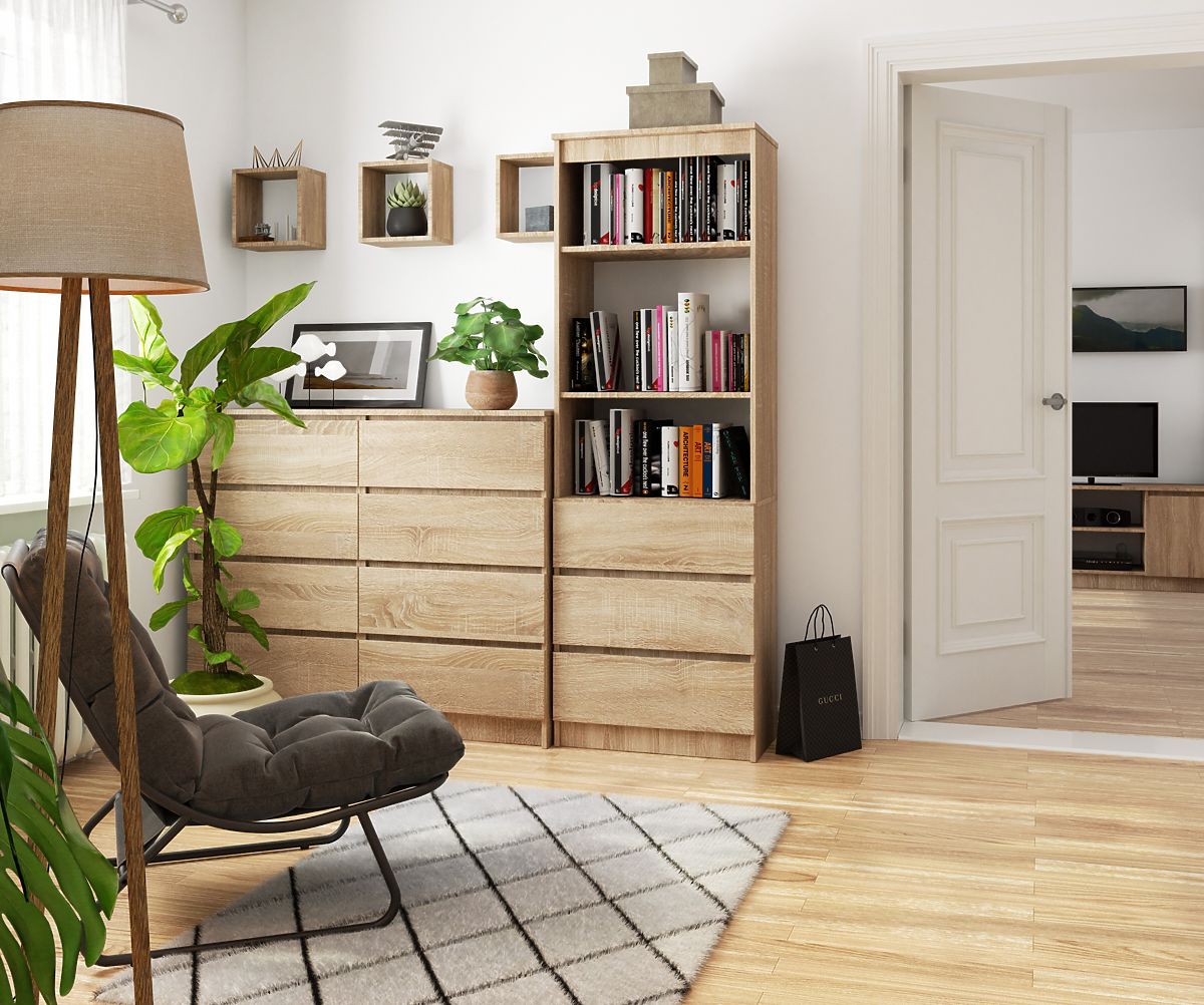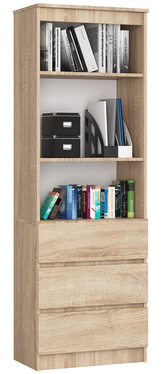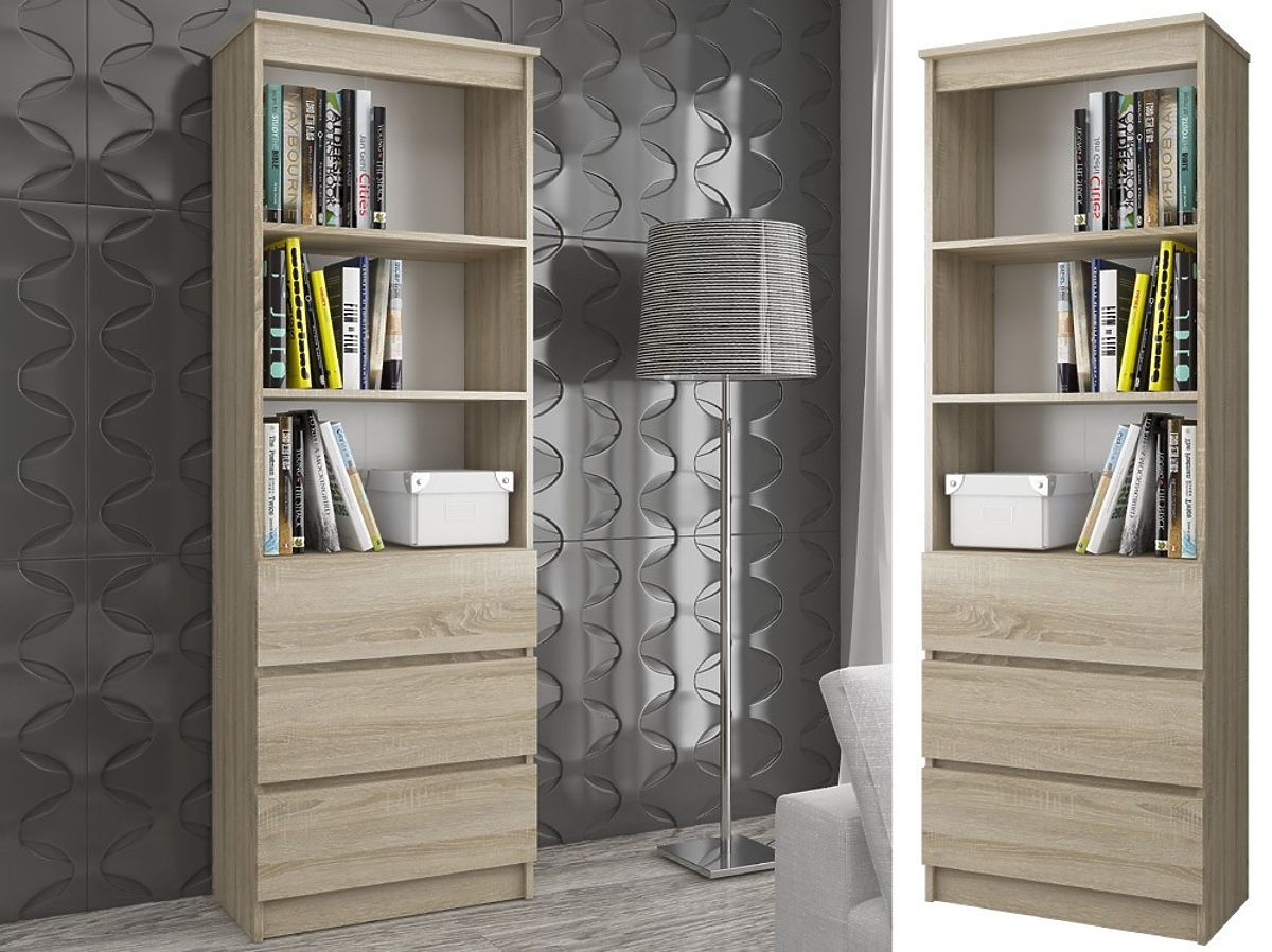 Lo scaffale ufficio CLP è un mobile pratico e versatile, adatto sia per l'ufficio che per ogni casa. Mantenuto nella classica tonalità di rovere sonoma, si abbina perfettamente ad altri mobili di questo colore, permettendo di creare composizioni molto efficaci. Lo scaffale è realizzato in pannello laminato di spessore 16 mm. È un materiale durevole e resistente, caratterizzato da un'elevata resistenza all'abrasione. I bordi sono ulteriormente protetti con bordo ABS, in modo che il mobile mantenga un aspetto gradevole anche con un uso quotidiano molto intenso. Lo scaffale è dotato di due ripiani su cui posizionare oggetti che si desidera esporre o avere a portata di mano. Tre cassetti profondi sono ideali per conservare oggetti meno rappresentativi e piccoli oggetti. L'insieme appare molto elegante e moderno. Lo stile universale consente un facile inserimento in interni con diverse destinazioni d'uso, arredati in stili diversi.