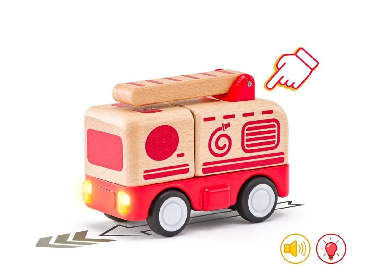 La nuova collezione di veicoli del marchio Woody sono macchinine adattate nella loro dimensione alle piccole mani. Realizzate in legno con elementi in plastica, dipinte con colori sicuri per i bambini. Hanno pneumatici in gomma morbida, che garantiscono una buona aderenza alla superficie. Premendo la macchinina si accendono le luci, si sente il segnale e il veicolo inizia a muoversi.
