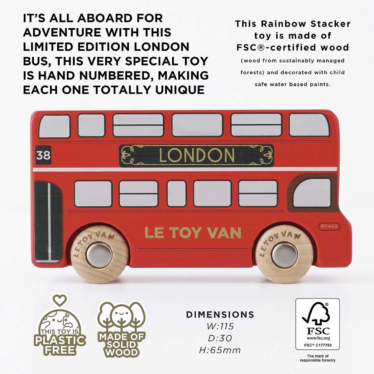 Parti per un'avventura con l'edizione limitata dell'autobus di Londra! Questo giocattolo in legno resistente è prodotto e numerato a mano nel Regno Unito - ogni pezzo è completamente unico! Verniciato nel tradizionale colore rosso con eleganti dettagli dorati e ruote robuste, è compatibile con tutti i garage e le ferrovie della linea Le Toy Van. L'autobus è realizzato in legno certificato FSC® (legno proveniente da foreste gestite in modo sostenibile) e decorato con colori a base d'acqua sicuri per i bambini. Giocattoli con uno scopoTutti i giocattoli di Le Toy Van sono realizzati per durare a lungo. Progettati con amore da artigiani esperti utilizzando pratiche etiche e materiali sostenibili, che sono più gentili con il nostro pianeta. Caratteristiche principali: realizzato eticamente in legno sostenibile FSC dipinto con colori atossici a base d'acqua testato secondo i più severi standard edizione limitata di autobus numerati a mano (solo 1000 pezzi in tutto il mondo) design classico vintage rosso prodotto nel Regno Unito Auto & costruzioni: La collezione di costruzioni e motori di Le Toy Van, che ha vinto molti premi. Finora ha ricevuto oltre 15 premi per auto immaginative e giocattoli da costruzione. Stimolano l'immaginazione dei bambini, sono perfetti per il gioco immaginativo, sviluppano la creatività e migliorano giocando la coordinazione occhio-mano dei bambini. Il marchio e il certificato FSC® (Forest Stewardship Council) garantiscono che il legno da cui è prodotto il prodotto non è stato abbattuto illegalmente e proviene da foreste gestite in modo sostenibile o vicino alla natura, in cui vengono rispettati rigorosi requisiti ambientali e sociali. Il marchio FSC® sul prodotto significa che con il tuo acquisto aiuti a proteggere le foreste e sostieni una gestione sostenibile, responsabile o vicina alla natura, grazie alla quale le nostre foreste sono più stabili, più sane, hanno una composizione di specie naturale e resistono meglio agli effetti negativi dei cambiamenti climatici.